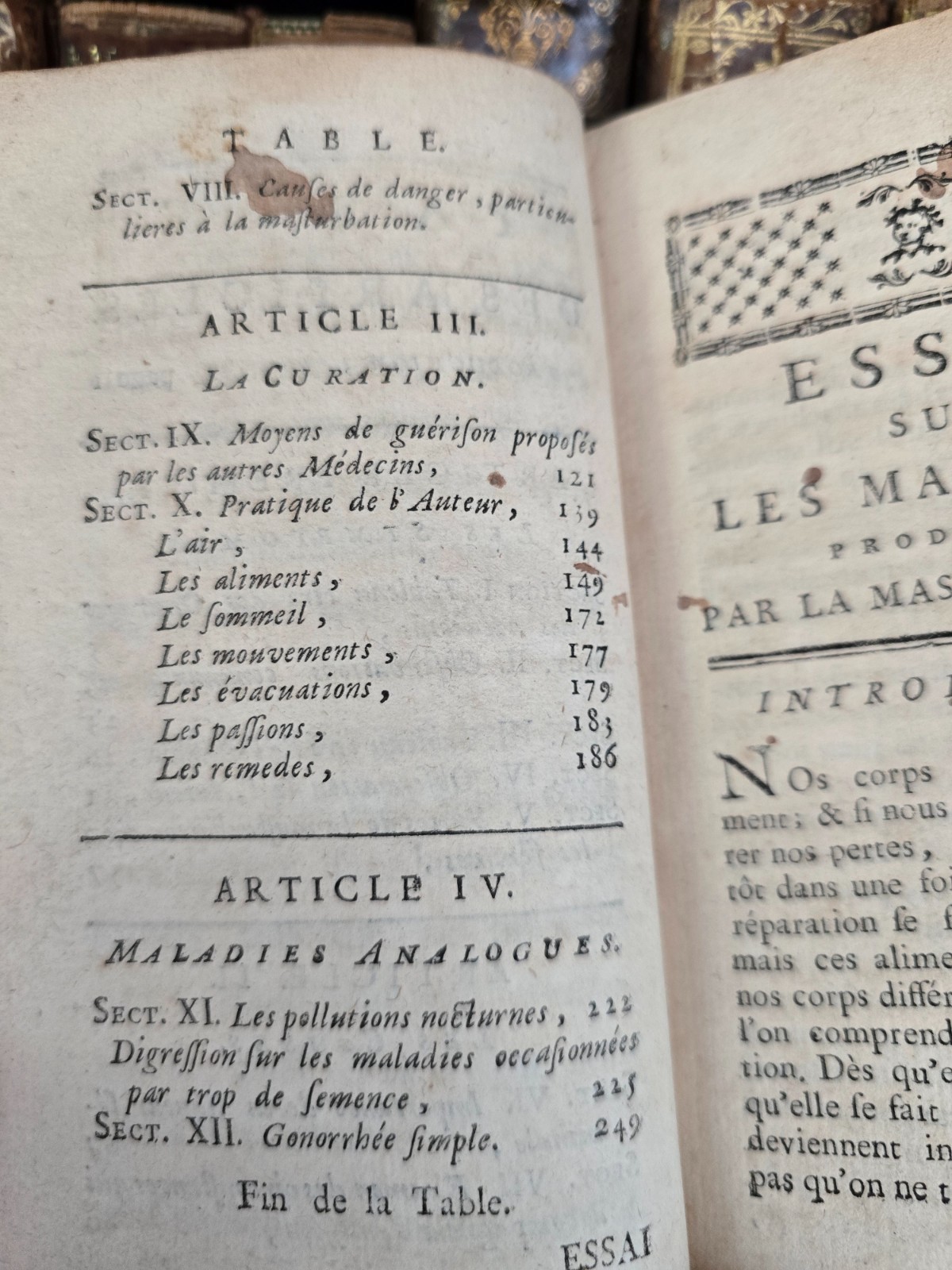 " Onanism. Dissertation on the Diseases Produced by Masturbation " Description: The book is titled " Onanism. Dissertation on the Diseases Produced by Masturbation " by Dr. Samuel Auguste André David Tissot, published in Lausanne in 1766 (third edition, considerably enlarged). This work became one of the most famous medical treatises of the 18th century on the supposed dangers of masturbation. It represents the medical, moral, and social anxieties of the Enlightenment period regarding sexuality, especially linking solitary practices to physical and psychological illness. Tissot’s text was highly influential in shaping European and later 19th-century medical discourse about sexual health, often used as a reference in moral and medical debates. Table of Contents: Introduction Article I – The Symptoms Section I. Survey of writings by physicians Section II. Communicated observations Section III. Extracts from Onania (earlier English treatise, 1712) Section IV. Observations by the author Section V. Consequences of masturbation in women Article II – The Causes Section VI. Importance of seminal fluid Section VII. Examination of circumstances accompanying emission Article III – The Cure Section VIII. Causes of danger particular to masturbation Section IX. Remedies proposed by other physicians Section X. Author’s own methods: Air Diet Sleep Exercise and movement Evacuation (bodily purging) Passions (control of emotions) Medicines Article IV – Related Diseases Section XI. Nocturnal emissions (wet dreams) Digression on diseases from excessive seminal loss Section XII. Simple gonorrhea Summary: Dr. Tissot argues that masturbation (referred to as onanism , after the biblical figure Onan) is not a harmless act but a destructive one leading to severe physical and psychological illnesses. He claims it causes weakness, memory loss, nervous disorders, digestive troubles, and even premature death. The treatise begins with collected medical observations and earlier literature, then expands into his own clinical notes. Tissot emphasizes that semen is a vital fluid, essential to strength and life, and that its loss leads to wasting diseases. He categorizes symptoms, explores supposed causes, and finally proposes cures: regulation of diet, air, sleep, exercise, and occasionally medicines. He also extends his analysis to related conditions such as nocturnal emissions and venereal diseases. Although now discredited, the book was extremely influential in Europe and America, fueling centuries of medical and moral campaigns against masturbation. It reflects Enlightenment-era attempts to link physiology, morality, and social order into a unified medical discourse. Pages: 270 Size: 6.6" x 4" x 1.2" See other $0.99 items