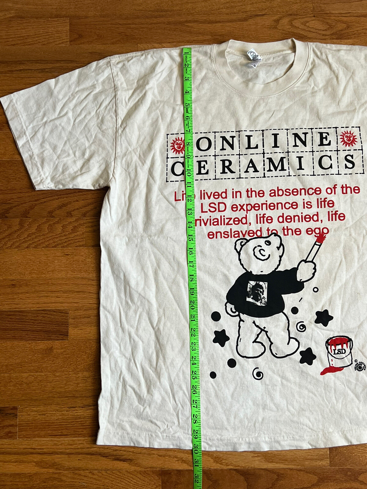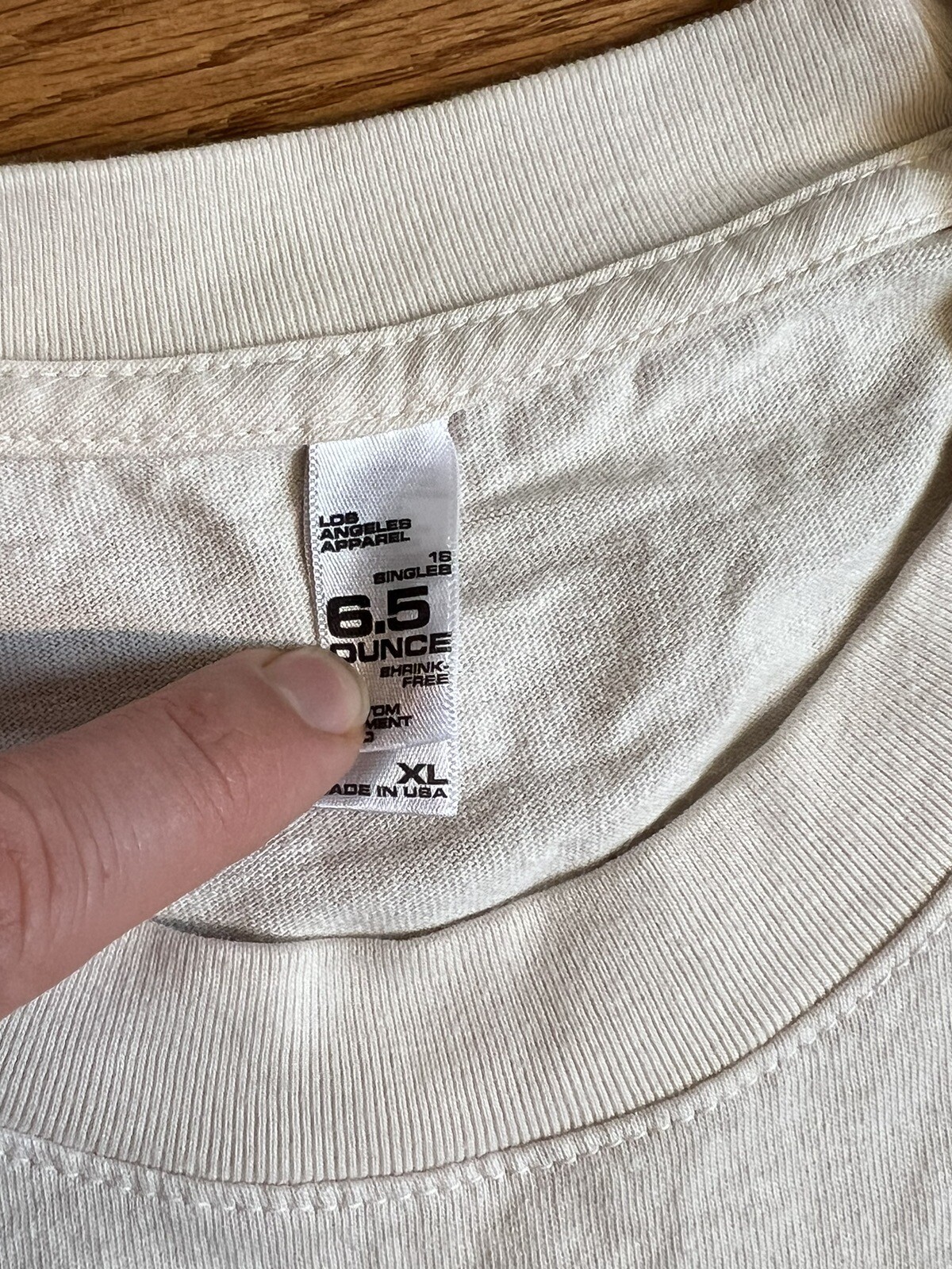 This Online Ceramics LSD Head T-shirt in cement color is a must-have for any fashion-conscious man out there. Made from high-quality materials, this T-shirt is designed to last and provide comfort all day long. Its size XL ensures the perfect fit for any body type while its regular size type is perfect for everyday wear. The tan color of this T-shirt adds a touch of elegance and sophistication to your outfit, while the unique LSD Head design by Online Ceramics makes it stand out from the crowd. Whether you're looking for a casual outfit or something more formal, this T-shirt is the perfect choice. New never worn or washed. LA apparel tag