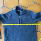 The Patagonia Blue Better Sweater Long Sleeve 1/4 Zip Pullover is a versatile and stylish piece for men's activewear. Made of cozy fleece polyester material, this pullover features a solid blue color with a mock neck and long sleeves for warmth. The 1/4 zip closure and pockets add functionality to the sweatshirt, making it perfect for outdoor activities like walking or hiking in winter, fall, or spring. This classic pullover from a trusted brand like Patagonia is a practical and timeless addition to any wardrobe. NOTE: brand embroidery on upper sleeve. Please see pic