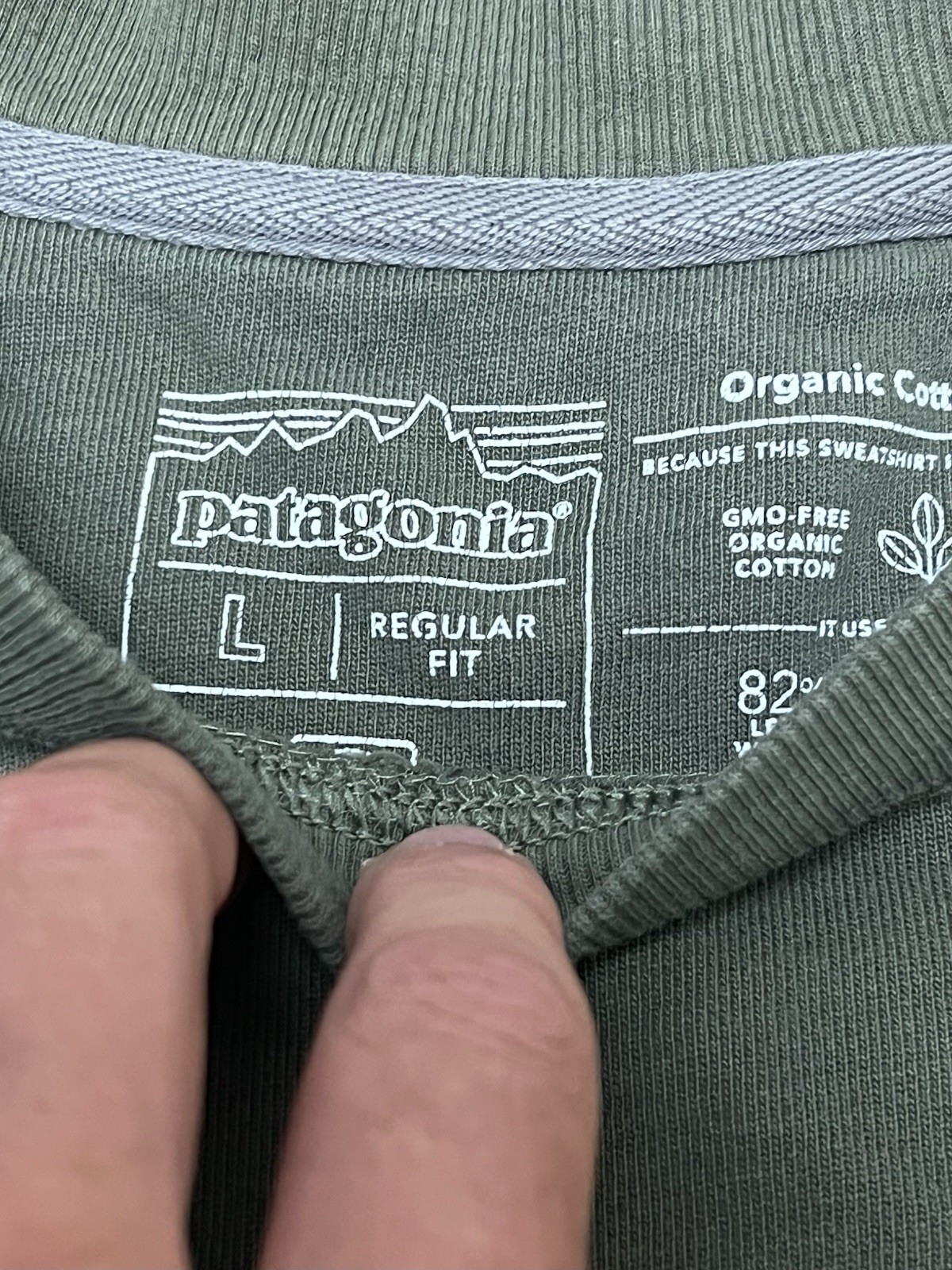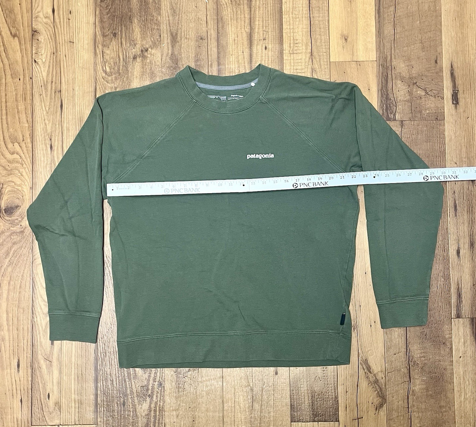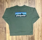 The product is a men's Forest Green graphic print crewneck sweatshirt by Patagonia in size Large. Made of cotton, this pullover sweatshirt features a solid green color with a logo accent. Perfect for outdoor activities like hiking, walking, and gym training, it is machine washable and suitable for all seasons. The long sleeve and crew neck design make it a comfortable and stylish choice for men looking for a versatile activewear piece.