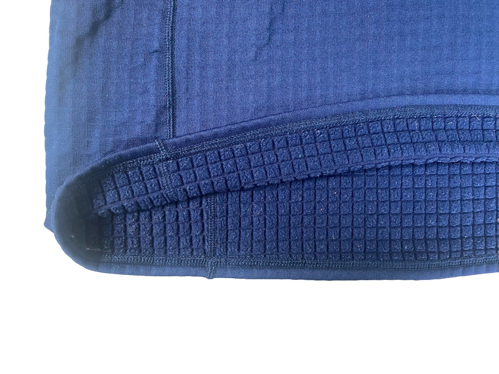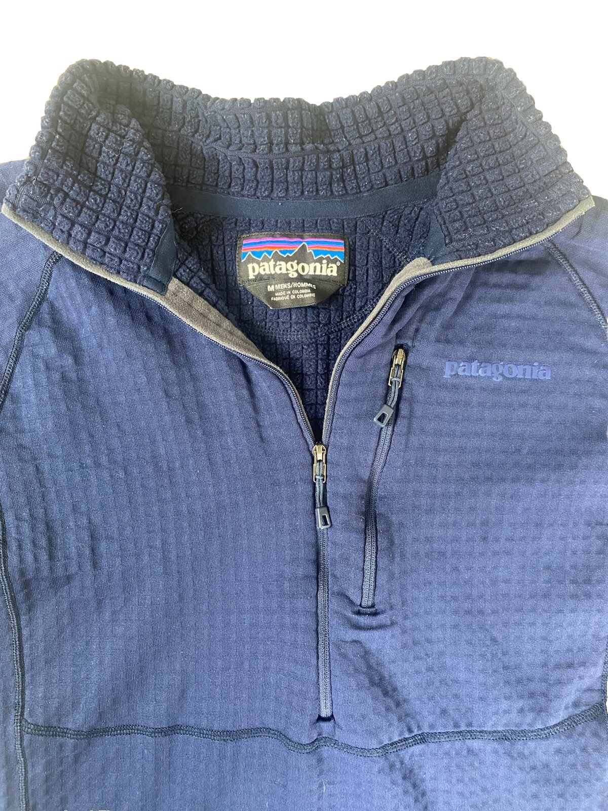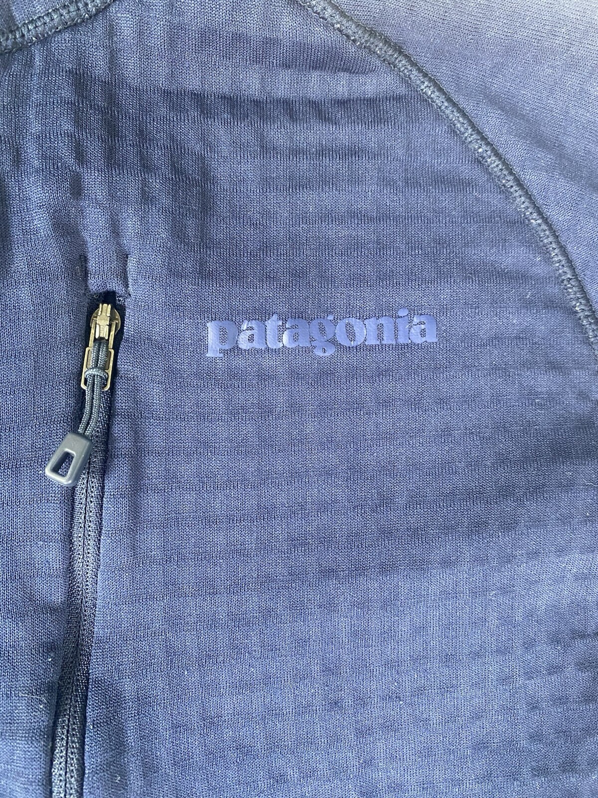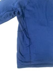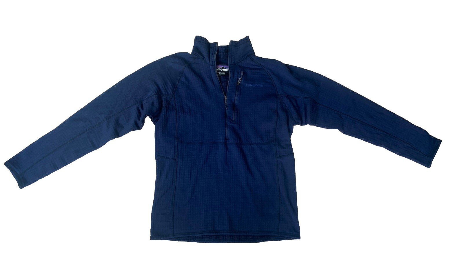 The Patagonia R1 Fleece Pullover is a stylish and functional piece of activewear for men. Made of polyester and spandex fleece, it features a 1/2 zip closure and a mock neck neckline for added warmth and comfort. This pullover is designed to be lightweight and moisture-wicking, making it perfect for various outdoor activities like hiking, skiing, or simply running errands in the city. The blue color and solid pattern add a classic touch to the garment, while the logo accents give it a sporty look. The inner lining has a fleece lining in a waffle pattern. Measurements: Length: 25 1/4” Chest: 19 1/2” Sleeve length: 21 1/2” Condition: Pre-owned, good condition. Some signs of wear on the interior mock neck.