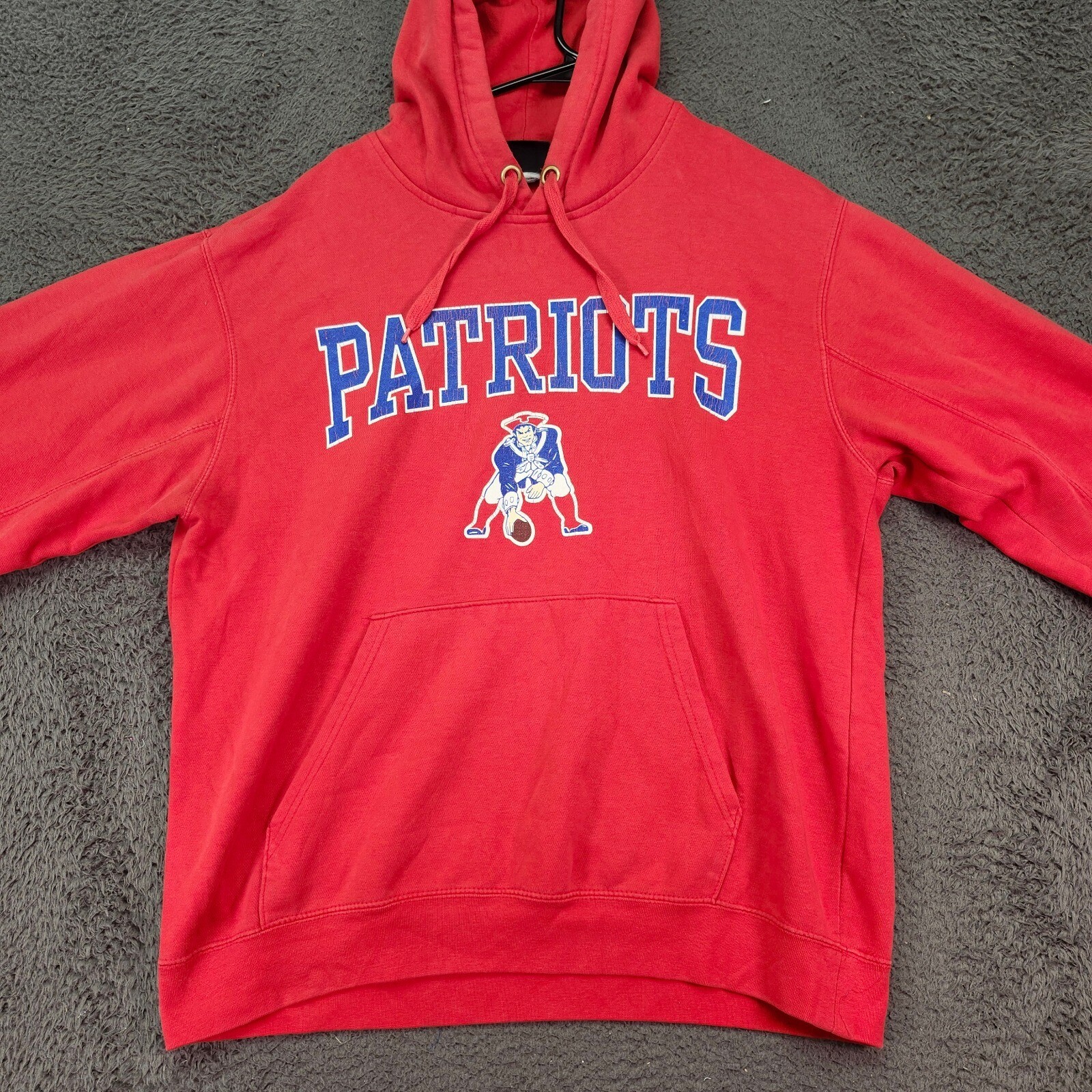 Red Patriots hooded sweatshirt, a spirited way to show team pride. This pullover hoodie features the iconic Patriots logo and team name prominently displayed on the front. It includes a comfortable hood with drawstrings and a convenient front pocket, perfect for keeping hands warm or storing essentials. The vibrant red color ensures you'll stand out in the crowd, whether you're at the game or just out and about. Type: Hoodie Color: Red Department: Men Style: Pullover Features: Hooded, Pockets, Drawstring, Graphic Print Closure: Drawstring Fabric Type: Fleece Character: Patriot, Football Player, Soldier, Team Mascot Performance/Activity: Football, Weightlifting, Gym & Training Pattern: Solid Accents: Logo Keywords: Patriots hoodie, NFL sweatshirt, football hoodie, red hoodie, pullover hoodie, team apparel, Patriots apparel, men's hoodie, sports hoodie, fan gear, Patriots gear, NFL, New England Patriots all items have been cleaned and disinfected we stand behind all items we sell so please contact us if you have an issue with any order