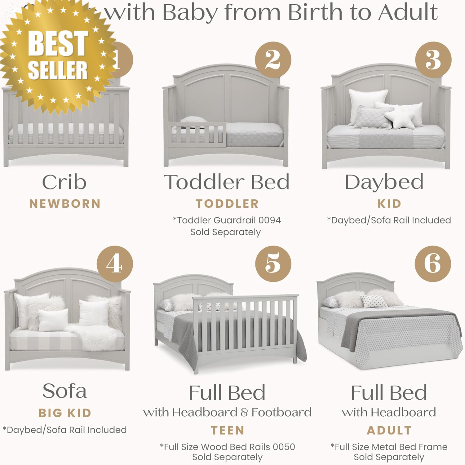 Fa lconbay_US Perry 6-in-1 Convertible Baby Crib Greenguard Gold Moonstruck Grey FEATURES ⚙️ Perry 6‑In‑1 Convertible Crib – GREENGUARD Gold Certified, Moonstruck Grey 🪶 Product Description Create a safe, stylish, and versatile nursery foundation with the Perry 6‑In‑1 Convertible Crib — a long‑lasting sleep solution designed to grow with your child from infancy through toddlerhood and beyond 🛏️✨. Built with your baby’s health and comfort in mind, this crib is GREENGUARD Gold certified to help ensure cleaner indoor air by limiting harmful chemical emissions, giving you peace of mind as your little one sleeps and plays. Crafted with quality sustainable wood and tested for safety, the Perry Crib transitions seamlessly from a traditional baby crib to multiple bed styles as your child’s needs change — making it a smart investment as your family grows. 📏 Specifications • Convertible Stages: 6‑in‑1 – Crib → Toddler Bed → Daybed → Sofa → Full Size Bed (headboard & footboard) → Full Size Bed (headboard only) • Certifications: GREENGUARD Gold, JPMA certified for safety • Materials: Sustainable wood (including New Zealand Pine) • Finish: Moonstruck Grey • Adjustable Mattress Heights: 3 positions • Mattress Compatibility: Standard‑size crib mattress (sold separately) • Assembled Dimensions: 55″ L x 30.5″ D x 45″ H 🔧 Key Features ✅ 6‑In‑1 Convertible Design: Evolves from crib to toddler bed, daybed, sofa, and full‑size bed options as your child grows. ✅ Certified for Healthier Air: GREENGUARD Gold certification means this crib is screened for over 10,000 chemicals and VOCs — great for sensitive nurseries. ✅ Safe & Non‑Toxic: JPMA certified and finished with a lead‑ and phthalate‑safe multi‑step paint process that exceeds CPSC & ASTM safety standards. ✅ Adjustable Mattress Heights: Three mattress positions help you find the safest and most useful setup as baby grows. ✅ Quality Construction: Made from sustainable wood for strength, durability, and lasting performance. ✅ Optional Accessories: Compatible with toddler guardrail (#0094) and full‑size rails (#0050) for extended use (sold separately). 🌟 Why You’ll Love It ✔️ Designed to grow with your child — from newborn to big kid. ✔️ Helps support healthier indoor air quality. ✔️ Timeless Moonstruck Grey finish fits any nursery décor. ✔️ Solid construction built for safety and longevity. ✔️ Great long‑term value with multiple conversion options. 📦 What’s in the Box • 1 × Perry 6‑In‑1 Convertible Crib (Moonstruck Grey) • Adjustable Mattress Support Rails • Assembly Hardware & Instructions 💡 Tips for Use • Always use a standard‑size crib mattress (sold separately) for best fit and safety. • Start with the mattress in the highest position for newborns and lower it as your child learns to sit and stand. • Add compatible toddler guardrails and full bed kits (sold separately) to extend use. • Check all bolts and screws periodically to ensure a secure fit as your child grows. 📦 Fastest Shipping Guaranteed Unlike other stores that offer cheaper products but come with delivery delays of up to 30 days, we take pride in offering fast and reliable shipping. Based in the American, we guarantee that your order will be delivered within 3–8 days, with no unexpected delays (unless under rare circumstances). When you shop with us, you’re choosing speed and satisfaction. 📦🚚 ❓ FAQs Q1: Is a mattress included? 👉 No — this crib requires a standard‑size crib mattress (sold separately). Q2: How long can this crib be used? 👉 This 6‑in‑1 design grows with your child — from crib to full‑size bed (conversion rails sold separately). Q3: Is this crib safe for newborns? 👉 Yes — it’s JPMA certified and finishes are tested for low chemical emissions. Q4: Does this crib adapt as baby grows? 👉 Yes — three adjustable mattress heights help ensure safety and comfort at every stage. Q5: Are conversion parts included? 👉 The daybed/sofa rail is included; toddler guardrail and full‑size conversion rails are available sold separately . Item model number W120650-1351 Item Weight 60 pounds Style Crib Material Walnut Assembly Required Yes Color Moonstruck Grey Special Feature Adjustable, Convertible Furniture Finish Pine Warranty Description 90 days. Maximum Weight Recommendation 50 Pounds Global Trade Identification Number 00080213097264 Batteries required No Tick-repellent material Wood Maximum Height Recommendation 45 Inches Included Components Crib, Daybed/Sofa Rail included Target Audience Toddler Product Dimensions 55"L x 30.5"W x 45"H 30.5 "h x 55.0 "h x 45.0 "h. Weight: 50.0 lb PAYMENT We accept all payments via Ebay using Credit Cards , Affrim, PAYPAL , Apple Pay and many others SHIPPING We are always working hard to ensure your package arrives as soon as possible. Please understand that some factors like weather, high postal traffic, and the performance of shipping companies are outside of our control. DELIVERY & RETURN POLICY We offer a 30-Day Return Policy on items in which you are not completely satisfied with. You have the option of a full-refund.
