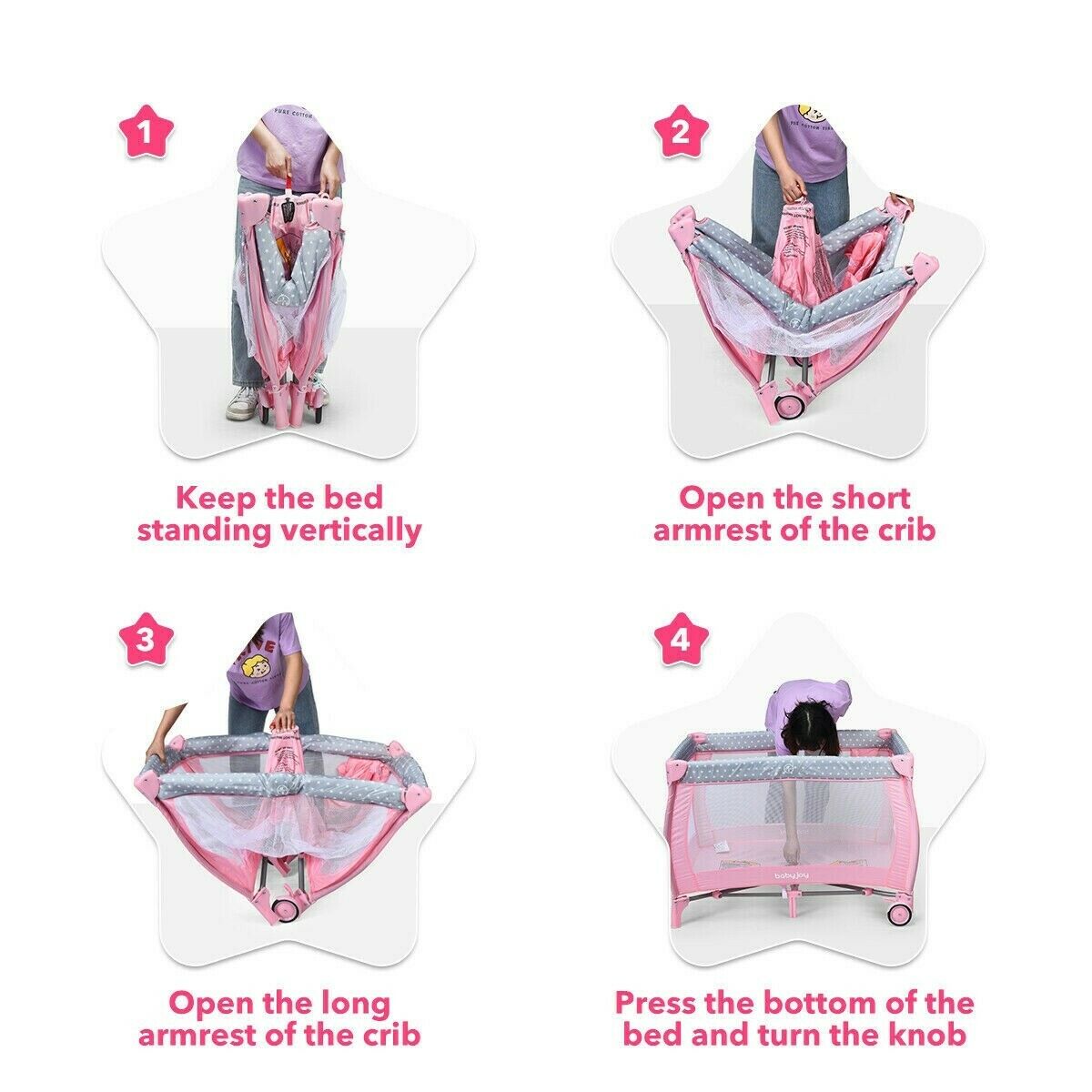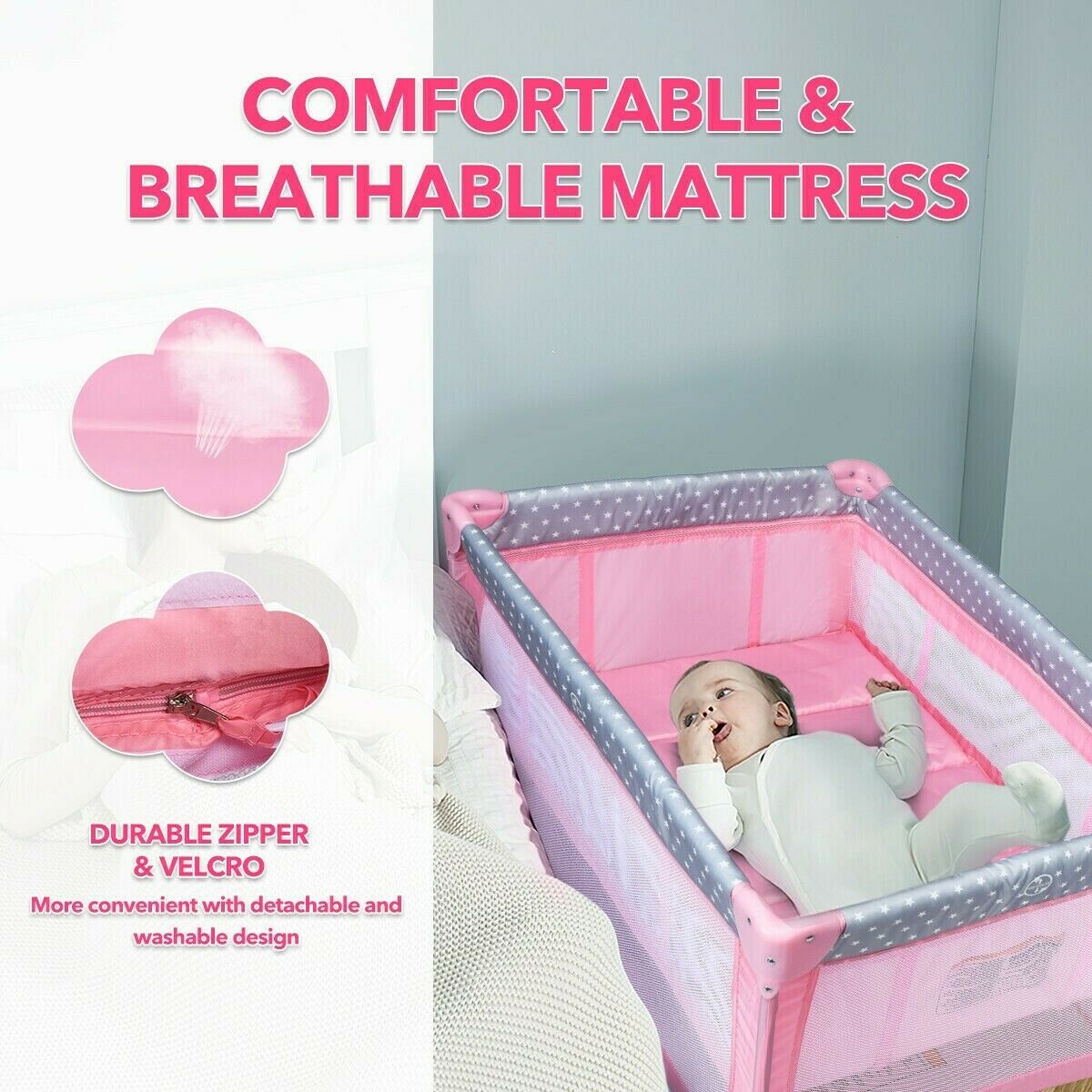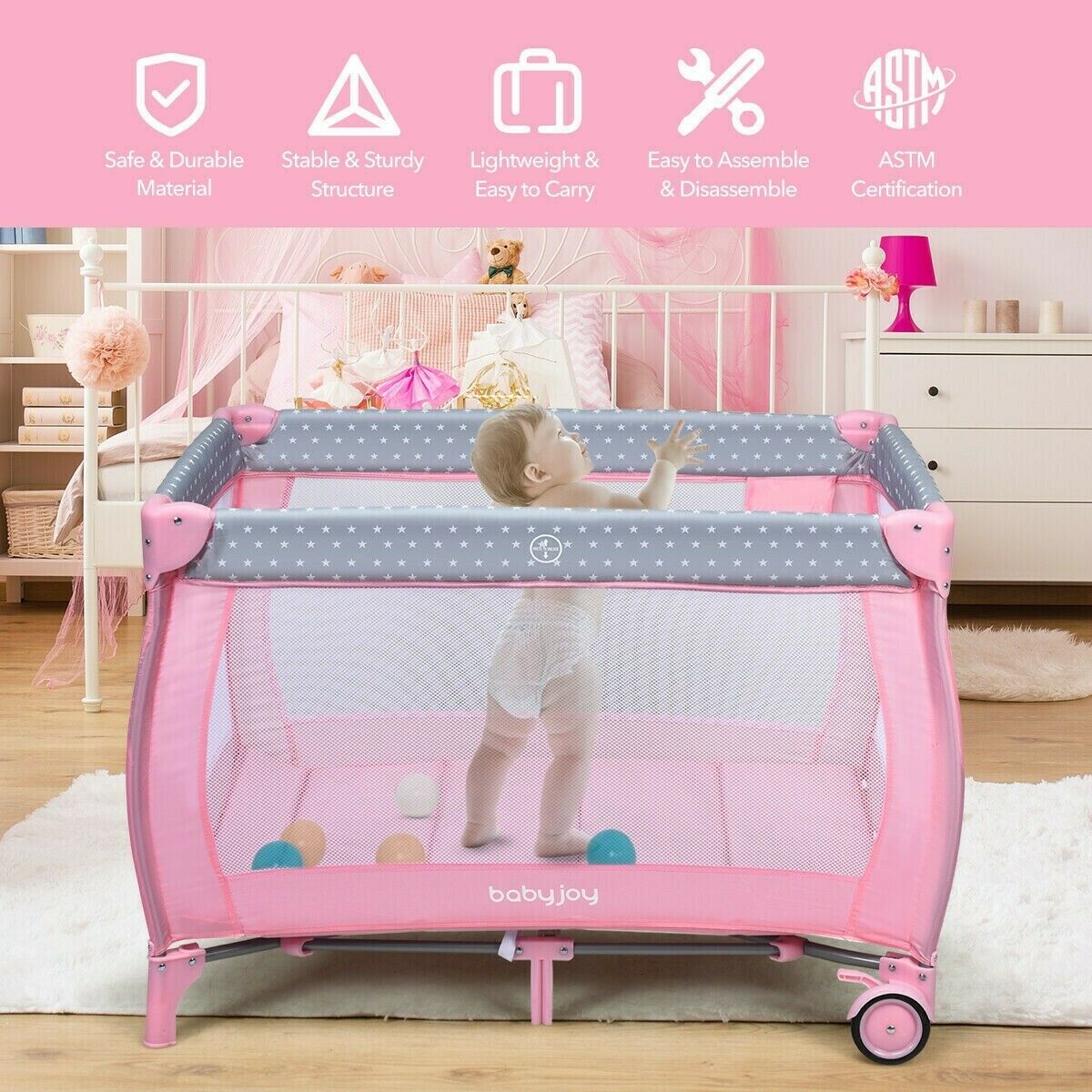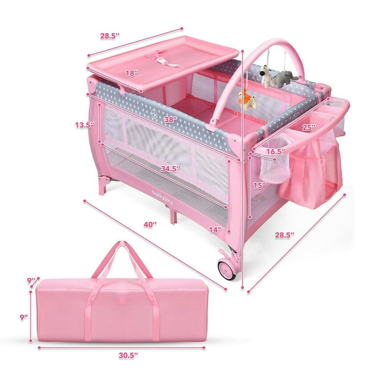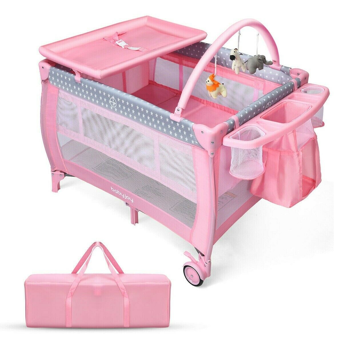 Pink Baby Crib Foldable Portable Bed Infant Playard Changing Table Play Center Description ASTM certified! Multi-functional Creation: This 3-in-1 child playard goes with the development of the infant. The diaper table permits the mother to effectively change diapers. Subsequent to eliminating the support, the wide space permits the infant to work on standing and playing. Furthermore, it is ASTM and CPSIA ensured and more secure to utilize. Stable and Solid Structure: The 7-point load-bearing structure of this present infant's play bed can viably improve the general steadiness and burden-bearing limit. Plus, the second-layer mattress upheld by great iron channels can give a stable and safe resting place for children. Separable and Foldable Plan: The Diaper racks, retires, and supports can be effortlessly eliminated from the child playard. What's more, the fundamental bed can be immediately collapsed up without additional devices. A purse causes you to store the collapsed crib and gives a spot to your child to rest when you go out to see family members or travel. 3 Alluring Hanging Toys: The 3 hanging toys pull in the child's consideration, advancing the infant's visual improvement as well as improving the getting a handle on capacity. At the point when kids attempt to get a handle on toys, their physical coordination can be improved imperceptibly. Also, the child playard is made of tough Oxford material, which won't hurt the infant's wellbeing. Advantageous and Adaptable Looking after children: are two widespread wheels with brakes at the base of the infant play yard so it can move deftly. The breathable work configuration gives a superior permeability to guardians to watch the child whenever. Likewise, the rack holding tight the side is advantageous for putting away different infant necessities The crib was manufactured after 2011 and complies with the new federal safety standards issued by the CPSC If more information needed, do not hesitate to send us a message! Shipping information We only ship this baby crib to the lower 48 states and do not combine shipping or offer local pickup. We do not ship to PO Boxes or APO'S. Do not hesitate to contact us for whatever you want!