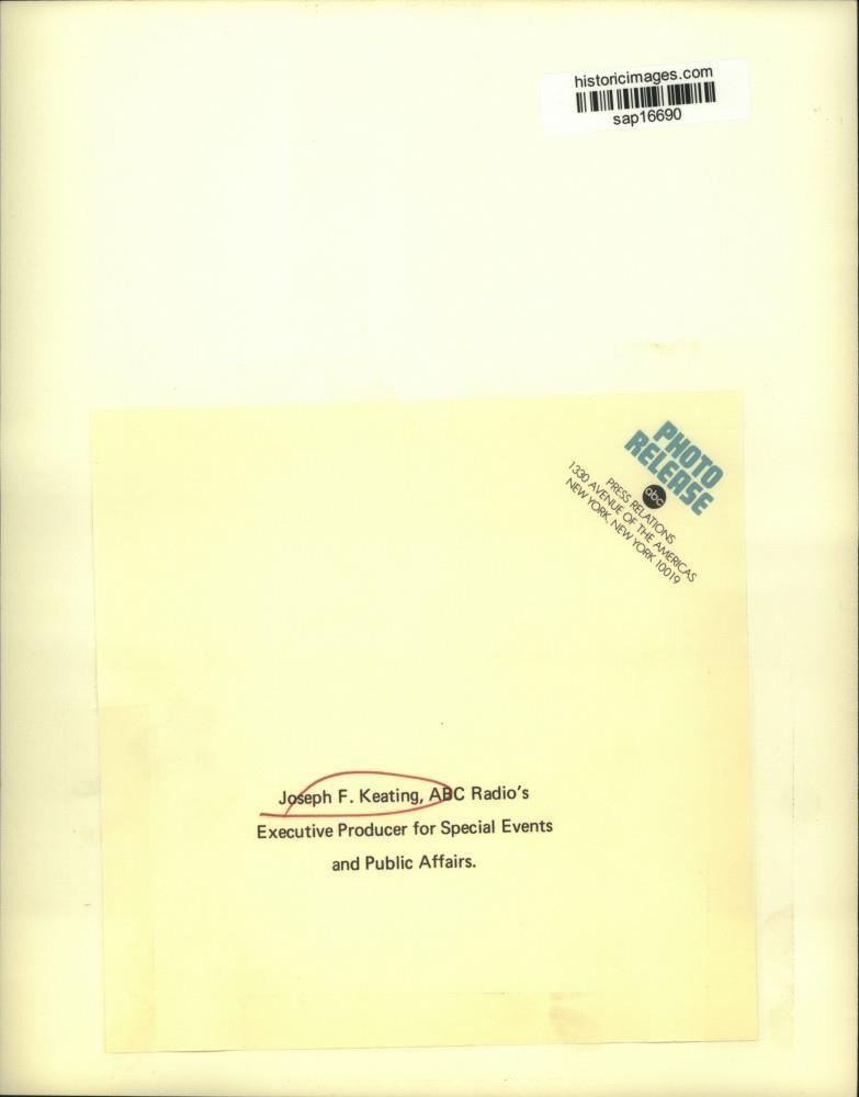 ebay template Note: Please study the images carefully to determine the condition of this vintage photograph, as it may not be in perfect condition. It may contain wrinkles, cracks, and possibly even tears due to its age and how it was handled before it got to us. A scanner may interpret colors and contrast differently than human eyes will, so it is possible that the actual photograph may be slightly darker or lighter in person. This vintage photograph is offered for sale as a collectible item and conveys no transfer of copyright. Press Photo Joseph F. Keating, ABC Radio's Executive Producer for Special Events This is an original press photo. Joseph F. Keating, ABC Radio's Executive Producer for Special Events and Public Affairs. Photo measures 7.25 x 9.25 inches. Photo is dated --None. PHOTO FRONT PHOTO BACK Historic Images Part Number: sap16690 Sell Smarter with Kyozou. Inventory and Ecommerce Management