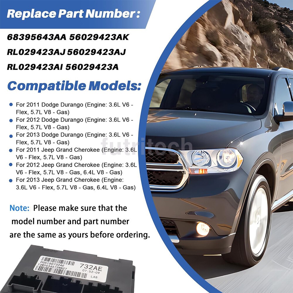 If you are not sure whether it is suitable for your car, please send us the VIN number. We have software to help you confirm it. Transfer Case Control Module 68395643AA For Dodge Durango Jeep Grand Cherokee 2011 2012 2013 The product is already pre-programmed, PLUG AND PLAY Sepcification: Superseded Part Number: 68395643AA Interchange Part Number: 56029423AK, RL029423AJ, 56029423AJ, RL029423AI, 56029423AI Fit: For Dodge Durango 2011 - 2013 For Jeep Grand Cherokee 2011 - 2013 About this item APPLICABLE MODELS: Compatible with 2011 - 2013 Dodge Durango, 2011 - 2013 Jeep Grand Cherokee. Replacement part numbers/OE numbers: 68395643AA, 56029423AI, 56029423AJ, 56029423AK, RL029423AI, RL029423AJ, RL029423AK. HIGH-QUALITY MATERIALS: Haufim splitter box control modules are made of high-quality materials for durability and long service life. EASY INSTALLATION: Product components can be replaced directly and professional installation is recommended. Package: 1x Transfer Case Control Module as pictured Compatible With: For Jeep Grand Cherokee: 2011 Jeep Grand Cherokee Laredo Sport 3.6L V6 / 5.7L V8 2011 Jeep Grand Cherokee Limited Premium Sport 5.7L V8 2011 Jeep Grand Cherokee Limited Sport 3.6L V6 / 5.7L V8 2011 Jeep Grand Cherokee Overland Sport 3.6L V6 / 5.7L V8 2012 Jeep Grand Cherokee Laredo Sport 3.6L V6 / 5.7L V8 2012 Jeep Grand Cherokee Laredo X Sport 3.6L V6 / 5.7L V8 2012 Jeep Grand Cherokee Limited Premium Sport 5.7L V8 2012 Jeep Grand Cherokee Limited Sport 3.6L V6 / 5.7L V8 2012 Jeep Grand Cherokee Overland Sport 3.6L V6 / 5.7L V8 2012 Jeep Grand Cherokee Overland Summit Sport 3.6L V6 / 5.7L V8 2012 Jeep Grand Cherokee SRT8 Sport 6.4L V8 2013 Jeep Grand Cherokee Limited Sport 5.7L V8 2013 Jeep Grand Cherokee Overland Sport 3.6L V6 / 5.7L V8 2013 Jeep Grand Cherokee SRT8 Sport 6.4L V8 2013 Jeep Grand Cherokee SRT Sport 6.4L V8 2013 Jeep Grand Cherokee Trailhawk Sport 2013 Jeep Grand Cherokee Laredo E Sport 3.6L V6 2013 Jeep Grand Cherokee Laredo Sport 3.6L V6 / 5.7L V8 2013 Jeep Grand Cherokee Laredo X Sport 3.6L V6 / 5.7L V8 2013 Jeep Grand Cherokee Limited Premium Sport 5.7L V8 2013 Jeep Grand Cherokee Limited Sport 3.6L V6 On Oct 11, 2024 at 01:15:29 PDT, seller added the following information: On Oct 31, 2024 at 18:17:25 PDT, seller added the following information: On Nov 8, 2024 at 21:36:44 PST, seller added the following information: On Nov 15, 2024 at 19:19:05 PST, seller added the following information: