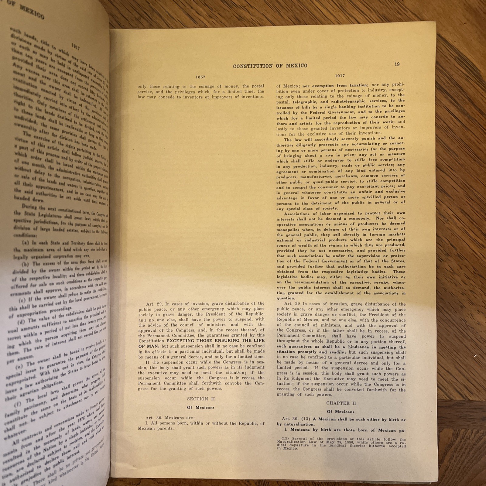 1927 Original Comparative Edition – Constitution of the United Mexican States of 1917 Compared with the Constitution of 1857 – American Chamber of Commerce, Mexico City Offered here is an artifact of extreme historical rarity and institutional significance. This original 1927 edition, printed in Mexico City by the American Book & Printing Co. for The American Chamber of Commerce of Mexico, provides a complete side-by-side translation and comparison of the Mexican Constitution of 1917 and the Constitution of 1857, compiled and translated by H. N. Branch, LL.B., with an introductory statement by Dr. L. S. Rowe, Director General of the Pan American Union. The Constitution of 1917 marked a revolutionary break from the liberal ideals of 1857, embedding protections for labor, land reform, secular education, and Mexican national sovereignty. This publication captures that historical shift in real time, intended to help English-speaking businessmen and government officials understand the radical structural and legal changes shaping modern Mexico. This is the only known copy for sale worldwide. We could not locate another example in any marketplace, archive, or library catalogue. This edition predates ISBNs, mass digitization, and modern reprints. The binding is fragile, with the original wraps detached but present. The text block is fully intact and legible, offering an irreplaceable view into the legal foundations of postrevolutionary Mexico. It belongs in a law library, a diplomatic archive, a Latin American studies collection, or the hands of a collector who understands what it is. Pieces like this do not circulate. They vanish into institutions or permanent private holdings, and when they’re gone, they’re gone for good. If you’re reading this, you’re likely holding the only opportunity you will ever have to own this piece. We specialize in one-of-one books, museum-grade documents, and ultra-rare historical artifacts. Follow our shop here on eBay. The next listing may never surface again.