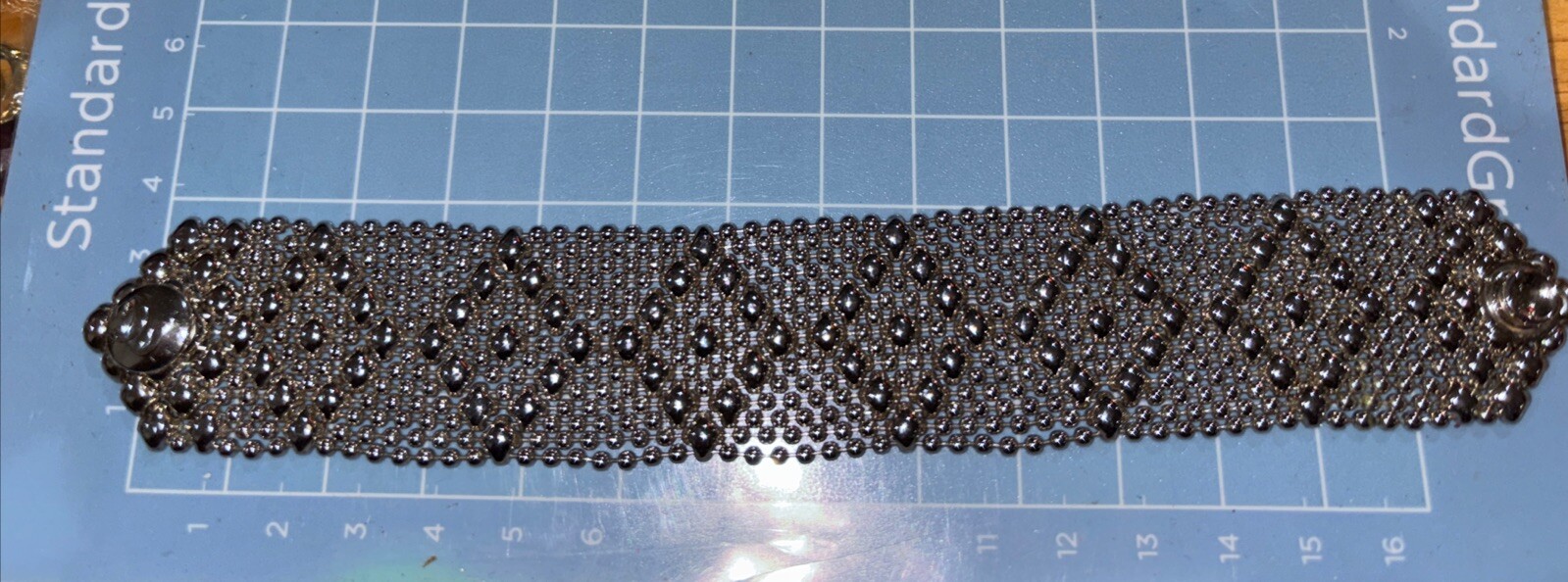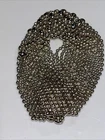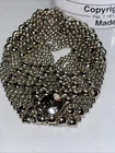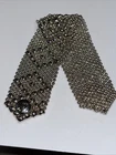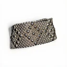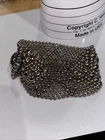 This is a silver-colored cuff bracelet made of nickel metal with a mesh chain type. It features a snap-on closure and is signed by the designer, Sergio Gutierrez. The bracelet is handmade and comes in 6 “ The brand is called Liquid Metal By SG and it has a fashion theme.