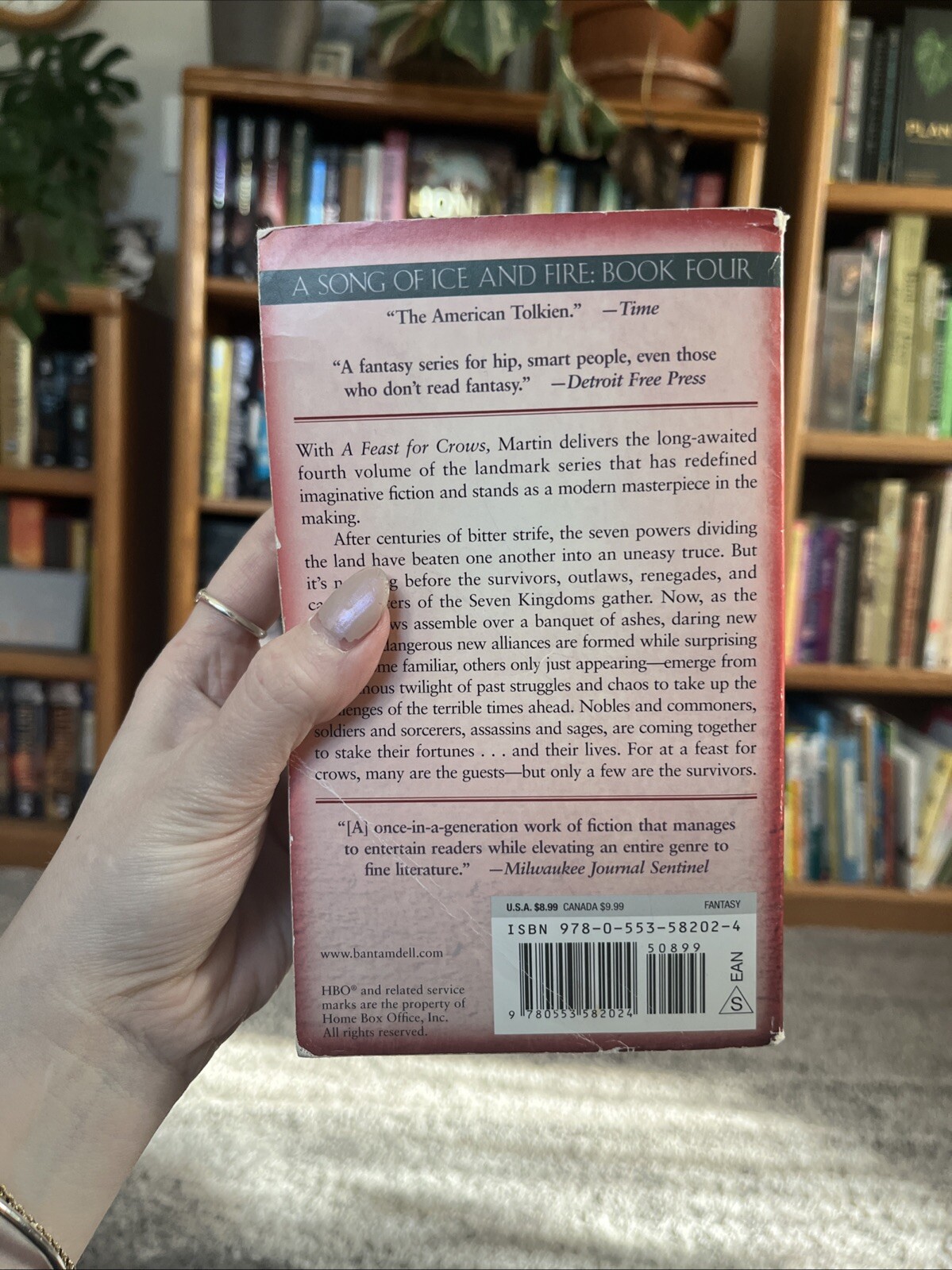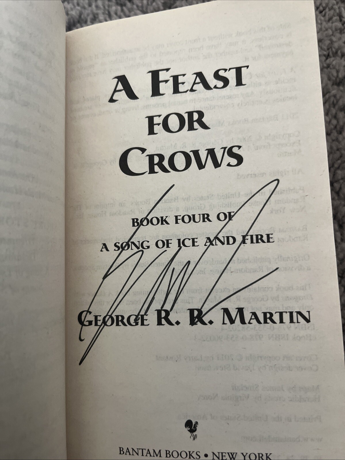 Signed:YesPersonalized:NoOriginal Language:EnglishBook Title:A Feast for CrowsCountry/Region of Manufacture:United StatesEx Libris:NoBook Series:A Song of Ice and FireAuthor:George R.R. MartinPublication Year:2006Format:PaperbackIntended Audience:AdultsNarrative Type:FictionGenre:FictionPersonalize:NoVintage:NoType:NovelLanguage:EnglishInscribed:No