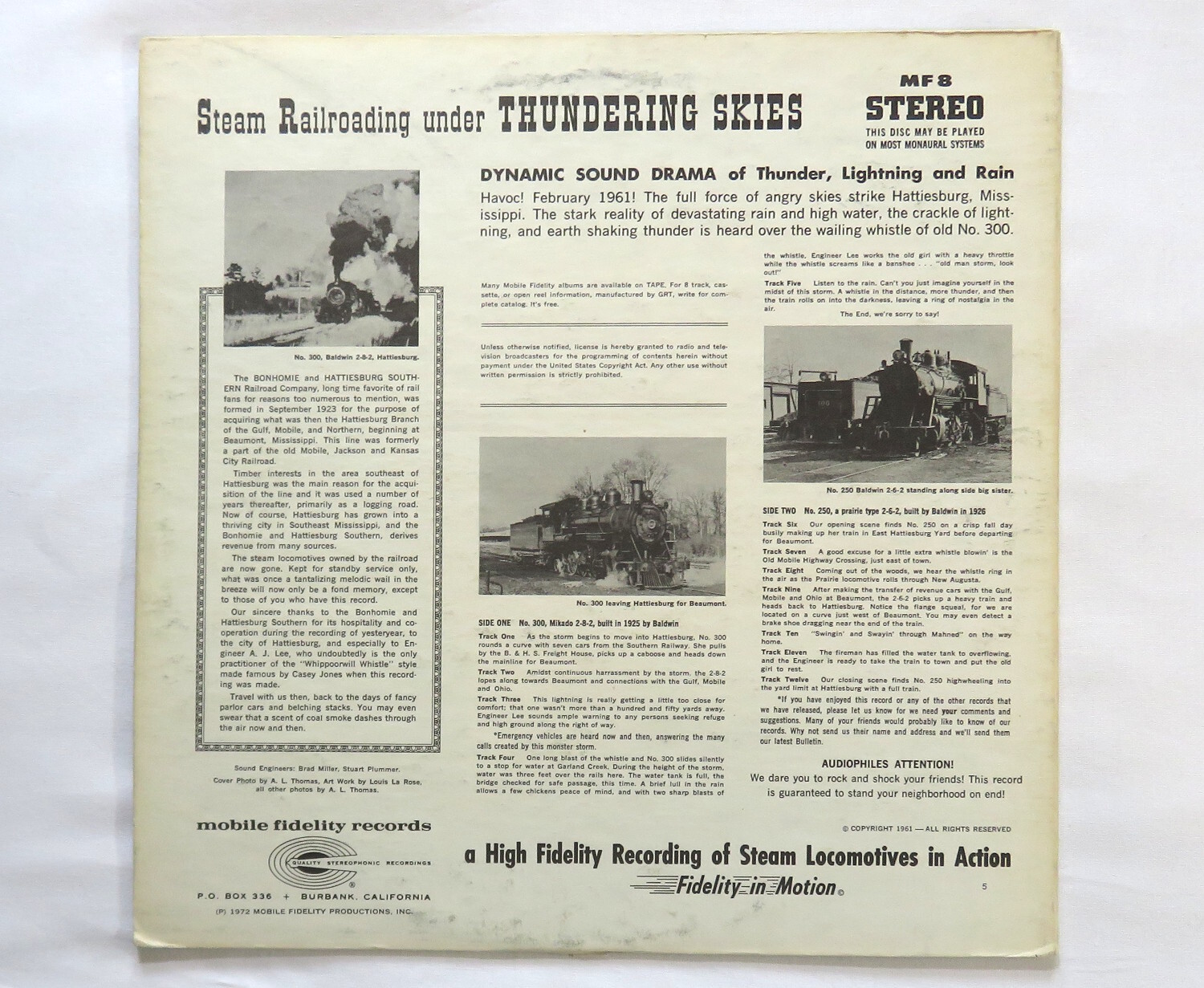 Steam Railroading Under Thundering Skies Record Vinyl 1972 USA Mobile Fidelity Steam Railroading Under Thundering Skies Record Vinyl 1972 USA Mobile Fidelity ITEM: Original USA 1970's press. CONDITION: Shiny vinyl with surface marks, cover with wear. ERA/GENRE: Railroad Trains memorabilia. OVERALL GRADE- GOOD+ PRICE: $12 Inventory Location: Record Shelf (Other) SHIPPING DETAILS: Choose your own shipping, you can choose Media, USPS Ground or Priority. We ship LP's in record boxes with bubble wrap. If you choose Priority there is padded envelope over box for safer shipping. All sales are final -no returns or exchanges- We provide accurate pictures and descriptions. Orders over $100 will require signature upon delivery. Combined shipping offered when possible. Thank you. Listing and template services provided by inkFrog