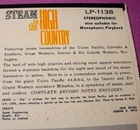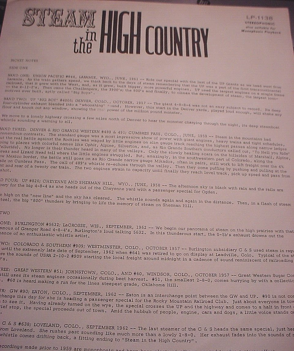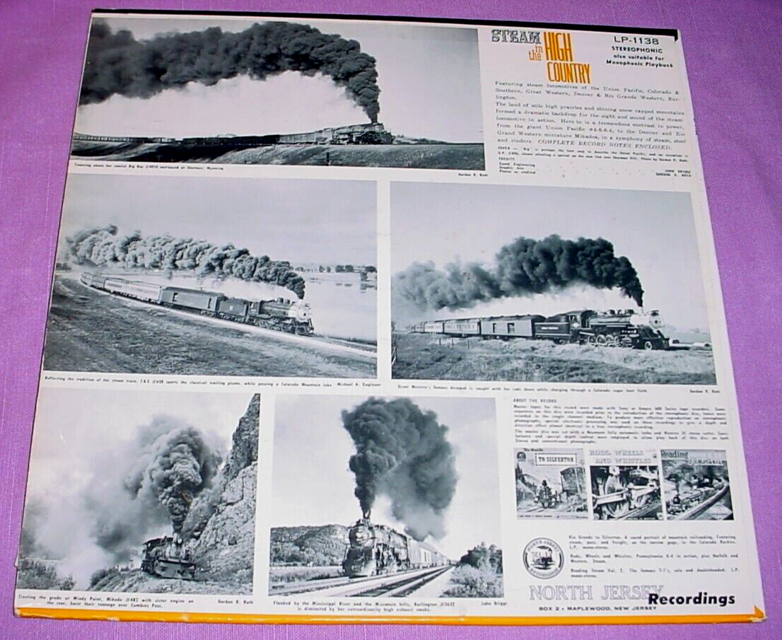 - ----------------------- ONE LP ONLY THIS SALE -- TRAIN SOUNDS !! - - --- STEREO & ENHANCED MONO RECORDINGS -- --- STEAM IN THE HIGH COUNTRY / - NEW JERSEY RECORDINGS LP LP-1138 - 1960'S ISSUE? FEATURING : UNION PACIFIC, COLORADO & SOUTHERN, GREAT WESTERN, D&RGW & BURLINGTON. - - FROM: U.P. 4-8-8-4 to Mikado / -- TRAIN Sounds W/ Notes VINYL LP is in VG- shape - surface wear but looks like no super deep scratches - - // SEE PICTURES -- the Cover is EX+, NO SPLITS... .great pictures ! - / We ship in record mailer boxes / - - - SEE MY OTHER EBAY AUCTION ITEMS THIS WEEK - - : - - < / >>MANY OTHER COOL MODELS & OLD TOYS ON EBAY THIS WEEK - - POSTAGE & WINNERS INFO BELOW ! - I WILL COMBINE SHIPPING ON MULTIPLE WINS -YOU CAN NOT PICK UP AT MY STORE IN SEATTLE ! - / NOTE PHOTOS MAY BE OFF REGISTER OR HAVE GLARE SPOTS / Please contact me if you have any questions: - - - P & H - LOWER 48 ONLY = $ 5.65 AK & HI may BE MORE !! - INSURANCE IS THE BUYERS OPTION !! - / / NO P & H - - - to CANADA , International Buyers - Please Note: Import duties, taxes and charges are not included in the item price or shipping charges. These charges are the buyer's responsibility. Please check with your country's customs office to determine what these additional costs will be prior to bidding/buying. These charges are normally collected by the delivering freight (shipping) company or when you pick the item up do not confuse them for additional shipping charges. We do not mark merchandise values below value or mark items as "gifts" - US and International government regulations prohibit such behavior. - NO OVER SEAS P & H / - WINNER WILL BE NOTIFIED - PAYMENT / PAYABLE TO: M&L , WE ACCEPT: CONFIRMED PAYPAL & MASTER CARD OR VISA, 1- 5 PM PACIFIC TIME, - - ADDRESS: M & L , 6504 RAVENNA AVE. N. E, SEATTLE, WA. 98115. - IMPORTANT ! WE DO NOT SHIP EVERY DAY ! Have Fun Bidding!