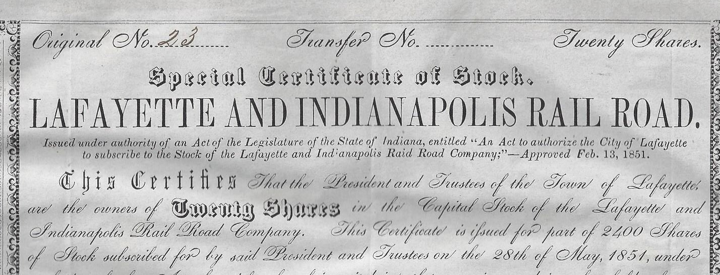 Lafayette & Indianapolis Railroad Company Ran between the two names cities Special Certificate of Stock Printed 20 Shares Capital Stock Certificate for 20 shares, #23 , Dated 1851 In Black on blue/gray paper President is Albert Smith White. Appointed by A. Lincoln to be a US District Court Judge in Indiana Biography included ** NOTEWORTHY ** Stock is glued to a piece of brown paper. Could beremoved PRINTER: Rossers' Power . Lafayette, Ind. Shown image copies are included with certificate Images: POSTAGE U.S. Sent First Class with tracking, starting @ $6.00 US Canada Sent First Class Canada with no tracking, starting @ $6.00 US NON U.S, case by case, starting @ $8.00 US, sent First Class. I do ship world wide. -- All the certificates and all other items I sell are sold as collectibles only; although they are authentic, they no longer hold financial value. I do have other items up for auction. I Do Combine