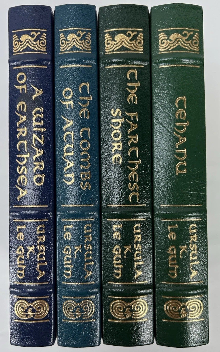 Earthsea Tetralogy 4 Volume Set “A Wizard of Earthsea”, “The Tombs of Atuan”, “The Farthest Shore”, “Tehanu” by Ursula K Le Guin, Collector's Edition, The Masterpieces of Science Fiction PLEASE BE AWARE: ORDERS OVER $750 REQUIRE A SIGNATURE UPON DELIVERY. This is eBay’s policy. I will ship USPS priority mail Distinctive cover design with beautiful illustration. Features jewel-tone leather bindings, gold foil lettering and decoration, with a hubbed spine. The book has elegant gilded page ends, readable typefaces, and permanent satin ribbon page markers. Durable thread-sewn pages, long lasting and high quality acid-neutral paper. Like new and unread condition, with unattached blank bookplate s for each book . Binding is tight and gold page edge gilding still shiny. Crisp, bright pages and satin ribbon page marker s in great condition. You will receive the exact item s shown, see pictures. Shipped with USPS Media Mail. Item is being sold AS IS.Before offering the item for sale I try my very best to find out as much information about the item so that I can give you an accurate description. Opinion on the items condition can vary, depending on the person who is looking at it. This is why I provide professionally taken, very large, clear and detailed photographs of the item from all angles. I depend on you to take your time to read the description, study the pictures carefully and to ask questions to satisfy yourself that the item is up to your expectations before bidding. If you have any questions regarding the item, or need additional photos, simply contact me through ‘ask seller a question’ at the top of the page and I will try my best to answer as soon as possible. Thank You! Four-Volume Set includes: A Wizard of Earthsea The Tombs of Atuan The Farthest Shore Tehanu A Wizard of Earthsea A Wizard of Earthsea is a fantasy novel written by American author Ursula K. Le Guin and first published by the small press Parnassus in 1968. It is regarded as a classic of children's literature and of fantasy, within which it is widely influential. The story is set in the fictional archipelago of Earthsea and centers on a young mage named Ged, born in a village on the island of Gont. He displays great power while still a boy and joins a school of wizardry, where his prickly nature drives him into conflict with a fellow student. During a magical duel, Ged's spell goes awry and releases a shadow creature that attacks him. The novel follows Ged's journey as he seeks to be free of the creature. The book has often been described as a bildungsroman, or coming-of-age story, as it explores Ged's process of learning to cope with power and come to terms with death. The novel also carries Taoist themes about a fundamental balance in the universe of Earthsea, which wizards are supposed to maintain, closely tied to the idea that language and names have power to affect the material world and alter this balance. The structure of the story is similar to that of a traditional epic, although critics have also described it as subverting this genre in many ways, such as by making the protagonist dark-skinned in contrast to more typical white-skinned heroes. A Wizard of Earthsea received highly positive reviews, initially as a work for children and later among a general audience. It won the Boston Globe–Horn Book Award in 1969 and was one of the final recipients of the Lewis Carroll Shelf Award in 1979. Margaret Atwood called it one of the "wellsprings" of fantasy literature. Le Guin wrote five subsequent books that are collectively referred to as the Earthsea Cycle, together with A Wizard of Earthsea: The Tombs of Atuan (1971), The Farthest Shore (1972), Tehanu (1990), The Other Wind (2001), and Tales from Earthsea (2001). George Slusser described the series as a "work of high style and imagination", while Amanda Craig said that A Wizard of Earthsea was "the most thrilling, wise, and beautiful children's novel ever". The Tombs of Atuan The Tombs of Atuan is a fantasy novel by the American author Ursula K. Le Guin, first published in the Winter 1970 issue of Worlds of Fantasy magazine, and published as a book by Atheneum Books in 1971. It is the second book in the Earthsea series after A Wizard of Earthsea (1969). The Tombs of Atuan was a Newbery Honor Book in 1972. Set in the fictional world of Earthsea, The Tombs of Atuan follows the story of Tenar, a young girl born in the Kargish empire, who is taken while still a child to be the high priestess to the "Nameless Ones" at the Tombs of Atuan. Her existence at the Tombs is a lonely one, deepened by the isolation of being the highest ranking priestess. Her world is disrupted by the arrival of Ged, the protagonist of A Wizard of Earthsea, who seeks to steal the half of a talisman that is buried in the treasury of the Tombs. Tenar traps him in the labyrinth under the Tombs, but she then rebels against her teaching and keeps him alive. Through him she learns more about the outside world, and she begins to question her faith in the Nameless Ones and her place at the Tombs. Like A Wizard of Earthsea, The Tombs of Atuan is a bildungsroman, which explores Tenar's growth and identity. Tenar's coming-of-age is closely tied to her exploration of faith and her belief in the Nameless Ones. The Tombs of Atuan explores themes of gender and power, in the setting of a cult of female priests in service to a patriarchal society, while providing an anthropological view of Kargish culture. Tenar, who became the subject of Le Guin's fourth Earthsea novel, Tehanu, has been described as a more revolutionary protagonist than Ged, or Arren, the protagonist of The Farthest Shore (1972), the third Earthsea volume. Whereas the two men grow into socially approved roles, Tenar rebels and struggles against the confines of her social role. The Tombs of Atuan shares elements of a heroic quest story with other Earthsea novels, but it subverts some tropes common to the fantasy genre at t
