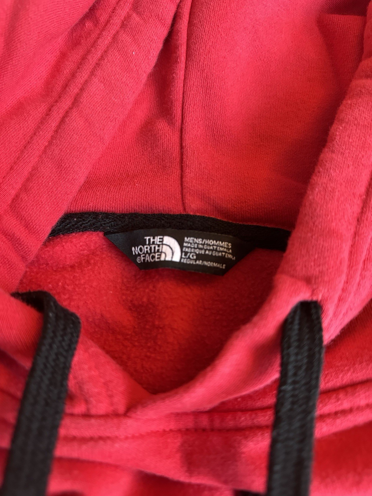 This product is a preowned The North Face men's drawstring hoodie in red and black, with a size L. It features a solid pattern, fleece fabric type, and the iconic The North Face logo accents. The hoodie includes pockets for added convenience and is designed for activities such as gym training, track and field, casual wear, walking, cycling, basketball, football, hiking, and running. With its comfortable and warm design, this pullover hoodie is perfect for all seasons and outdoor adventures.