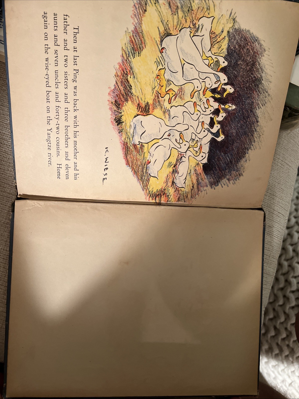 The Story About Ping By Marjorie Flack and Kurt Wiese Published by Viking Press, 1933 Hardcover (No Dust Jacket) ⸻ This is an early first edition (or possible first printing) of the classic children’s book The Story About Ping, published in 1933 by Viking Press. This edition includes: • Original pictorial hardcover boards with blue cloth spine • Full-color illustrated title page • Copyright reads “Copyright 1933 by Marjorie Flack & Kurt Wiese” • No mention of later printings or reprints — consistent with first issue copies 🦆 The Story About Ping is one of the most beloved picture books of the 20th century, illustrated by Kurt Wiese and cherished by generations. Early Viking Press editions like this are increasingly scarce. ⸻ 📚 Condition: • Binding is firm and all pages intact • No loose pages or major tears • Light edge wear and scuffing to covers, as shown • Some light age-related smudging to pages and boards • No dust jacket Please see photos for exact condition. Ships securely and carefully. ⸻ 🔍 Keywords (for backend): Ping first edition 1933, Viking Press, vintage children’s book, classic picture book, Marjorie Flack, Kurt Wiese, duck story, rare kids book, homeschool, Waldorf, Caldecott era