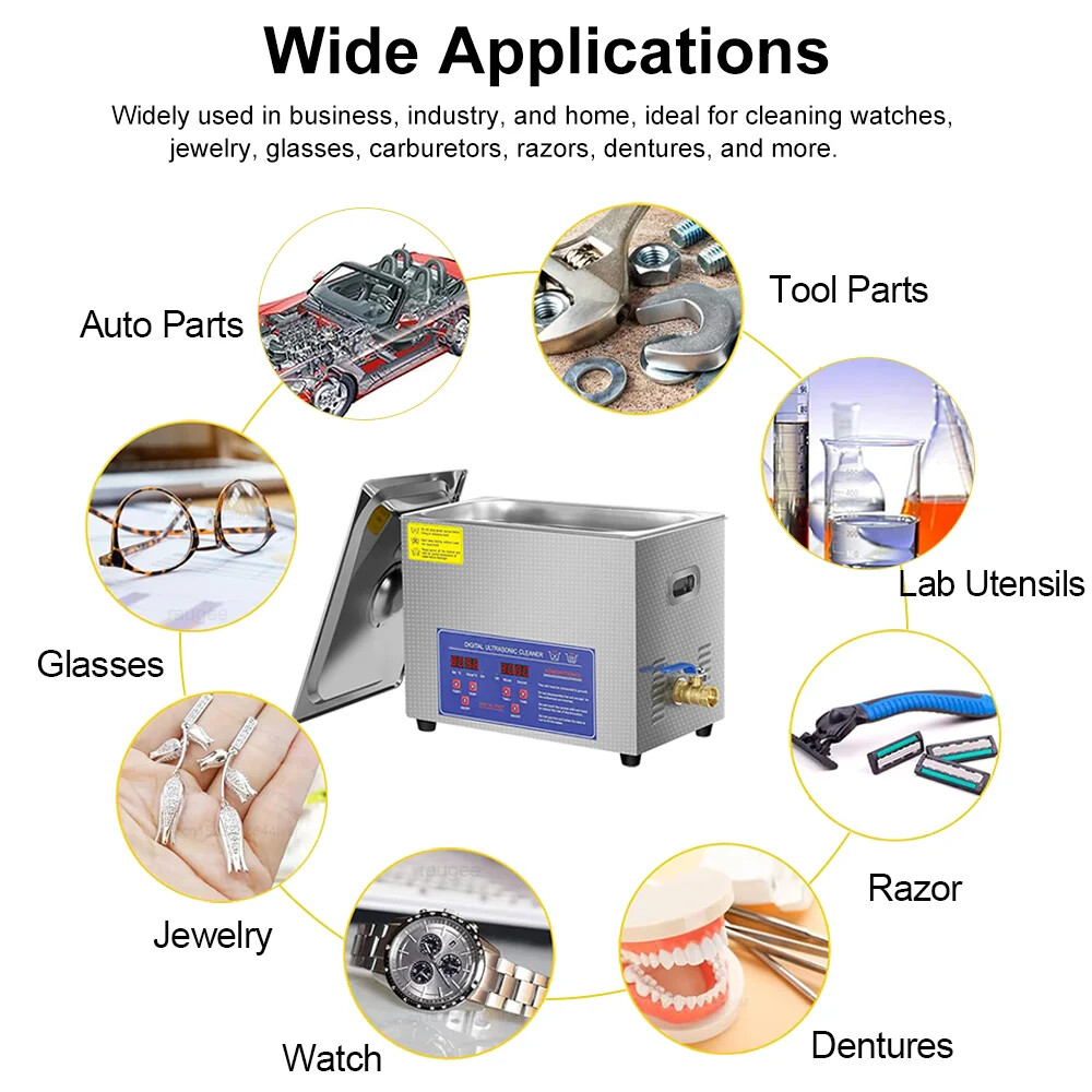 1.Powerful Cleaning Effect: 40kHz ultrasonic frequency can be used to clean objects with complex surfaces. Ultrasonic power 60W-600W, heating power 100W-600W. The scientific frequency and power parameter design of the ultrasonic cleaner can effectively clean the items. 2.Special Capacity Design: Capcity 1.3L/2L/3L/6L/10L/15L/22L/30/ .It is made of high quality 304 stainless steel,which is more durable and sturdy to last for many years,coming with matching basket for keeping your coin,ring,diamond,jewelry,watches and small parts in place. 3.Digital Control Panel: The Cleaning machine features a digital display for precise time and temperature control.Available setting rang, Time:0-30mins,Temperature:0-80℃/176℉.The digital panel with easy operation and elegant apperance satisfying the most customers. 4.Practical Application: This ultrasonic cleaner,with excellent apperance, performance and special capacity design, is widely used for cleaning jewelry,eyeglasses,watch,circuit board, dental equipment,tableware,and other small parts,FCC/CE/RoHS/UL Certified. 5.Warm Reminder: 1.Noise will be generated when the ultra sonicare cleaner is working, which is unavoidable. Closing the lid can reduce noise. Notice: Please select the correct Voltage for your country, EU Plug 220V/US Plug 110V. ultrasonic cleaner is a curved surface, the actual volume will be smaller.