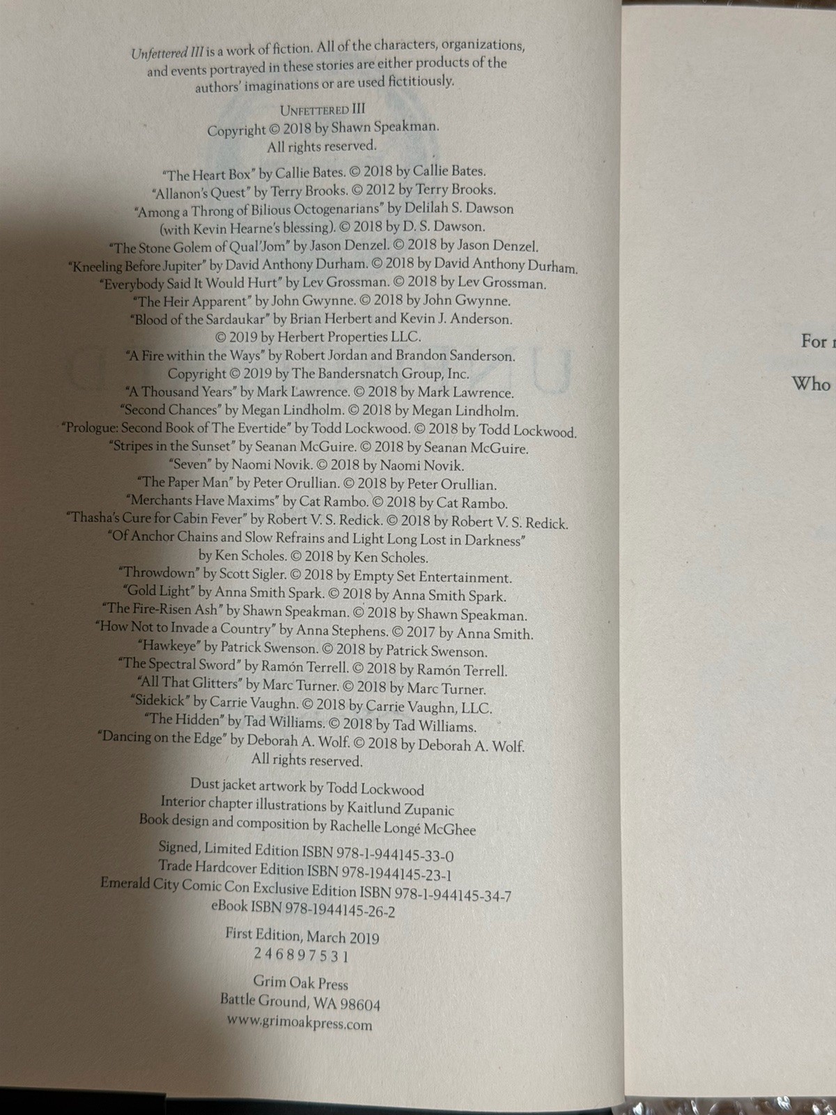 This product is a *BRAND NEW * First Edition Hardcover book titled "Unfettered III: New Tales by the Masters of Fantasy" From the award-winning anthology Unfettered comes the newest installment in the science fiction and fantasy series, edited by Shawn Speakman. Published by Grim Oak Press in “March of 2019,” this book falls under the genres of Science Fiction/Fantasy and Literature & Fiction and it offers a unique and collectible item for fans of fantasy literature. Item Specifics: -This book is a: **BRAND NEW-UNREAD** 1st. Edition Hardcover copy limited by Grim Oaks Press. -Please reference the ISBN numbers to confirm 1st print/1st Edition authentication. -The Book *PICTURED* is the *EXACT ONE YOU WILL RECEIVE* + Limited Edition book marker.