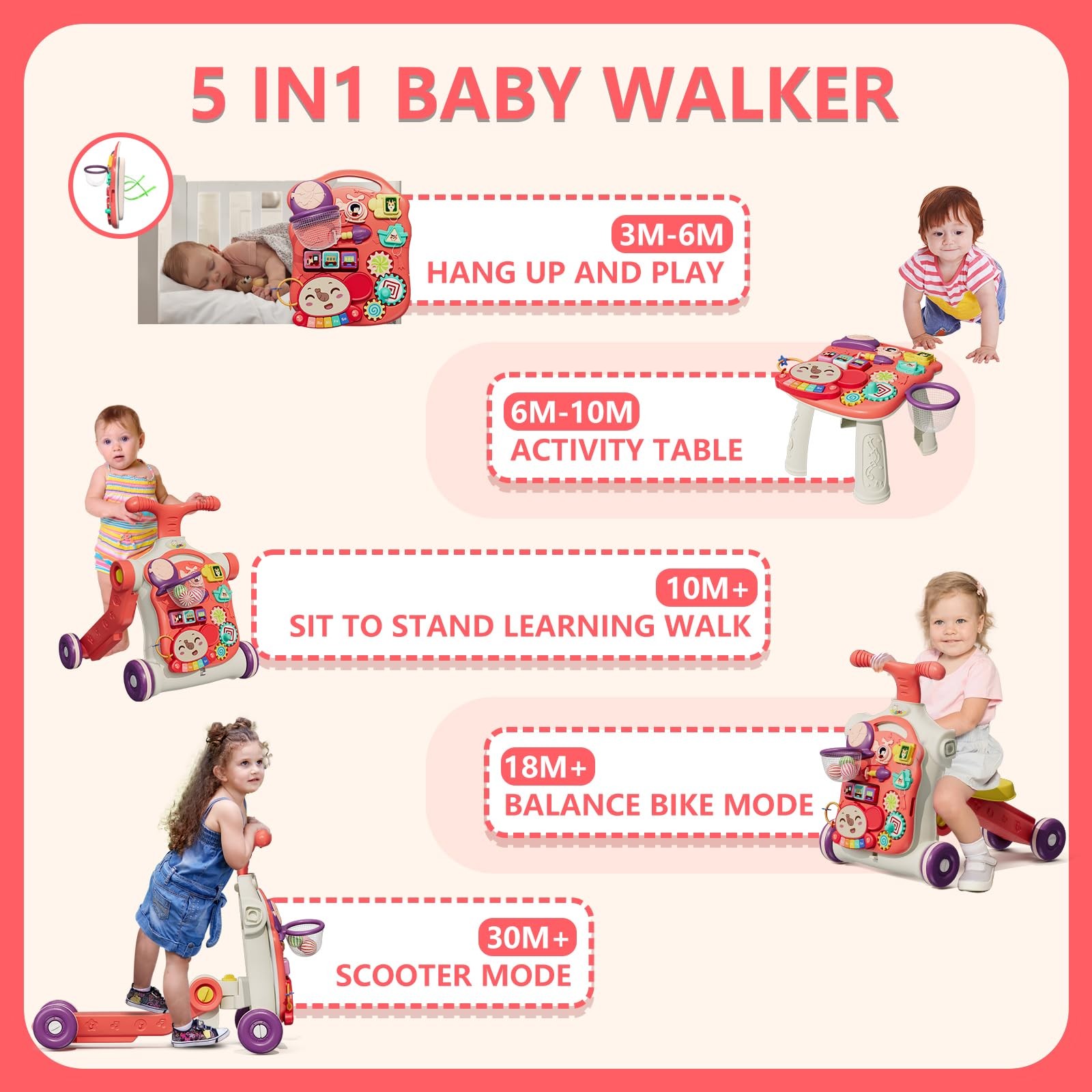 The 5-in-1 Grow-With-Me Walker offers five exciting stages of play - transforming seamlessly from walker to scooter, motorbike, play table, and activity center to support natural balance development. Its interactive learning panel features a basketball hoop (with 3 balls), shape sorter (3 blocks), spinning rollers, and removable piano keyboard to develop early skills in colors, shapes, and music. With smart speed control through a non-slip rubber ring and rotating rear wheel, it adapts to your 's growing abilities. The ergonomic triangular base promotes proper posture and healthy leg development while preventing O-shaped legs, all crafted from durable, non-ASTM-certified ABS plastic. Perfect as a gift for birthdays, holidays, and baby showers, this versatile walker grows with your while delivering endless fun and developmental benefits. 5 Stages of Play – Seamlessly transforms from walker to scooter, motorbike, play table, and activity center. Supports natural balance development while keeping playtime exciting. Learn Through Play – Interactive panel includes: ①Basketball hoop with 3 balls ②Shape sorter with 3 blocks ③Colorful spinning rollers ④Removable piano keyboard, develops early skills in colors, shapes, and music. Smart Speed Control – Non-slip rubber ring and rotating rear wheel provide adjustable resistance, growing with your 's walking abilities. Ergonomic Design – Triangular base promotes proper posture and healthy leg development, helping prevent O-shaped legs. ASTM-certified and made from durable, non-ABS plastic for safe play. The Gift That Grows – Perfect for birthdays, holidays, and baby showers. Loved by parents and little ones alike!