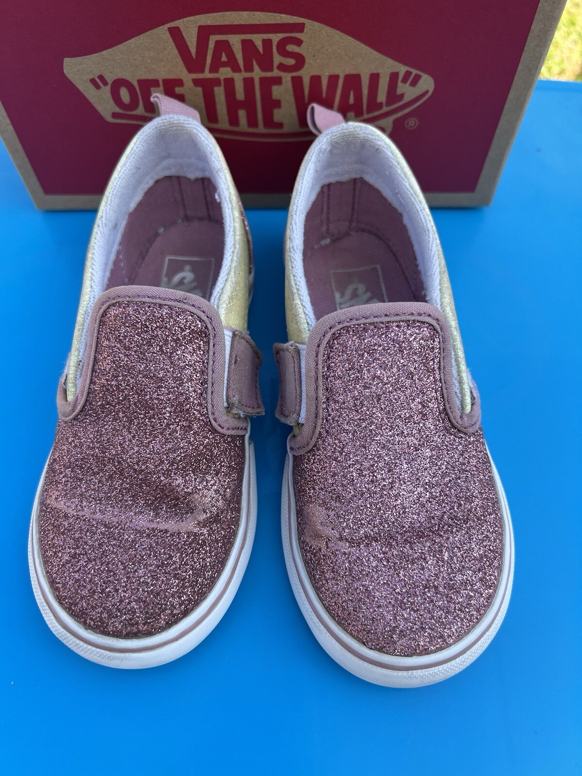 VANS Toddler Classic Slip-On V Sneakers Size 9.5T Glitter Two Tone Pink/Yellow PRE-OWNED WITH ORIGINAL BOX Very lightly worn in great condition with original box Elevate your little one's style with these Vans Classic Slip-On V Glitter Two Tone shoes. The Pink/yellow glitter two tone pattern adds a fun and trendy touch to any outfit. These slip-on loafers are perfect for casual wear, school, walking, dancing, and even skateboarding. The shoes come in a UK size 9 and US size 9.5, with an EU size of 2. The slip-on closure ensures easy wearing and taking off, while the low top shoe shaft style provides comfort and support. These Vans Classic Slip-On shoes are a must-have for any toddler's shoe collection.