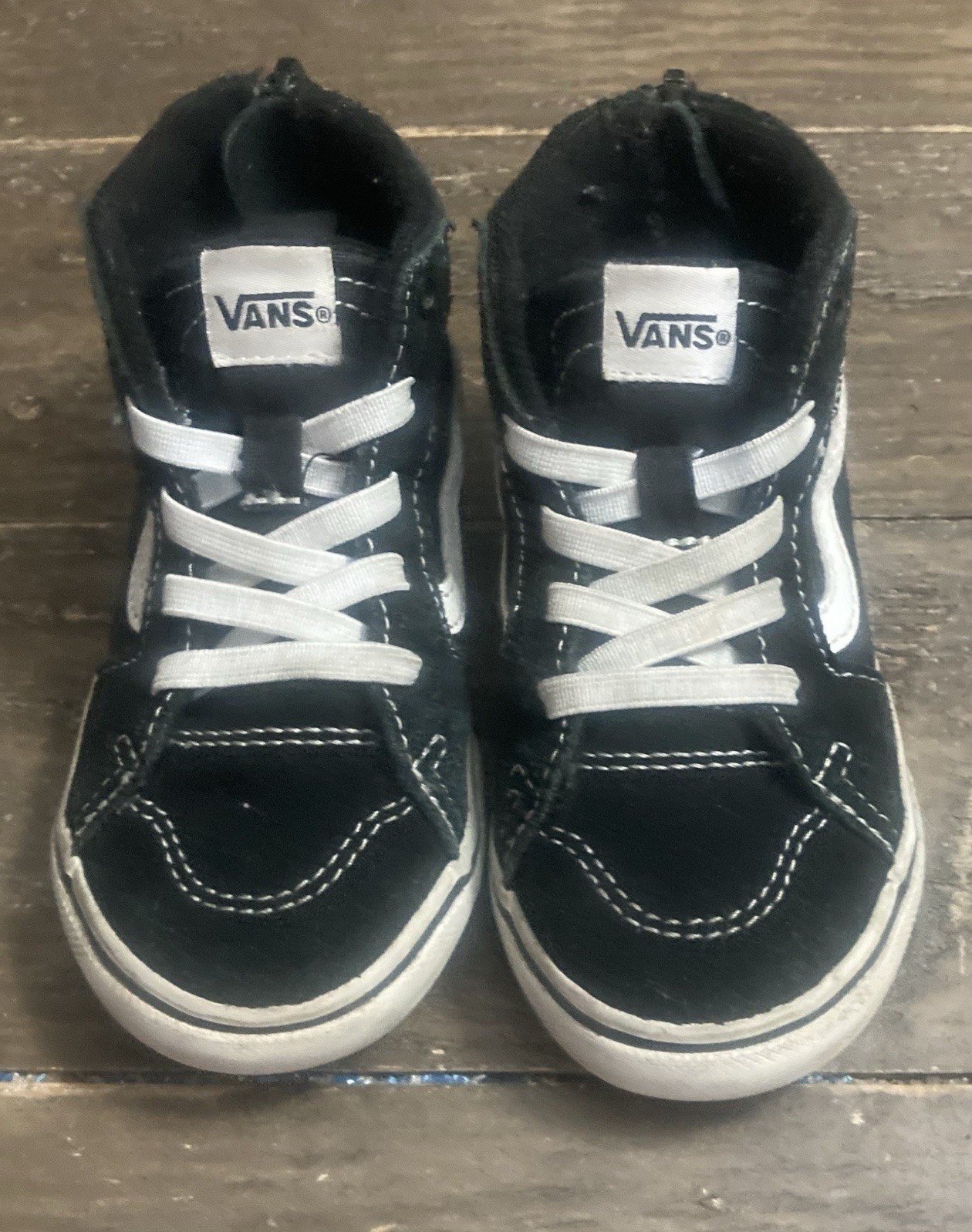 This product is a pair of Vans high top toddler shoes in size 7, featuring a classic black color with a zipper back closure. The shoes are part of the Vans Off The Wall collection and are made of synthetic material. They are designed for casual wear and have a unisex style, suitable for both boys and girls. With the Vans brand known for its quality and style, these toddler shoes are sure to be a fashionable and comfortable choice for any young child.