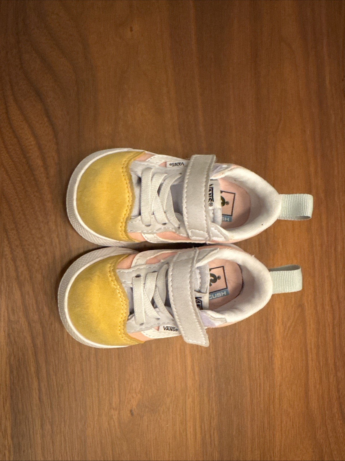 Adorable toddler Vans sneakers in size 5! Super cute color combo with pink sides and yellow suede toes. Easy on/off design with both elastic laces and velcro closure — great for independent toddlers. - Brand: Vans - Size: Toddler 5 - Style: Low-top sneakers - Colors: Pink, yellow, white - Elastic laces + velcro closure for secure fit - Rubber soles for great traction Condition: Pre-owned and gently used. Some light wear/scuffs at the toes consistent with normal kid use (see photos). Overall still in good shape with tons of life left!