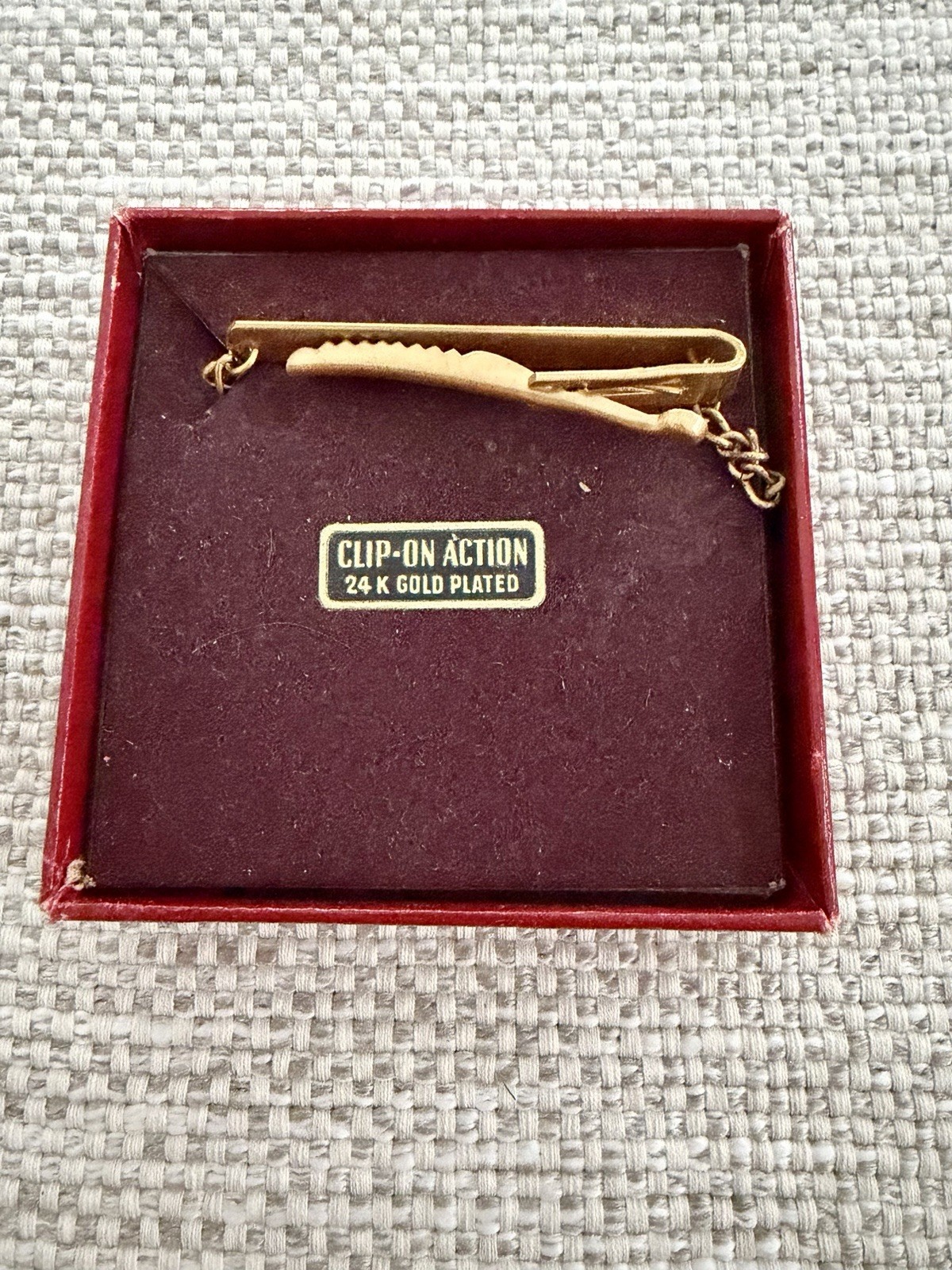 Vintage "CLIP-ON ACTION" 24k gold-plated tie bar (or tie clip) with a safety chain. It is designed for securing a necktie to a shirt placket from the mid-20th century. In original box without box top.