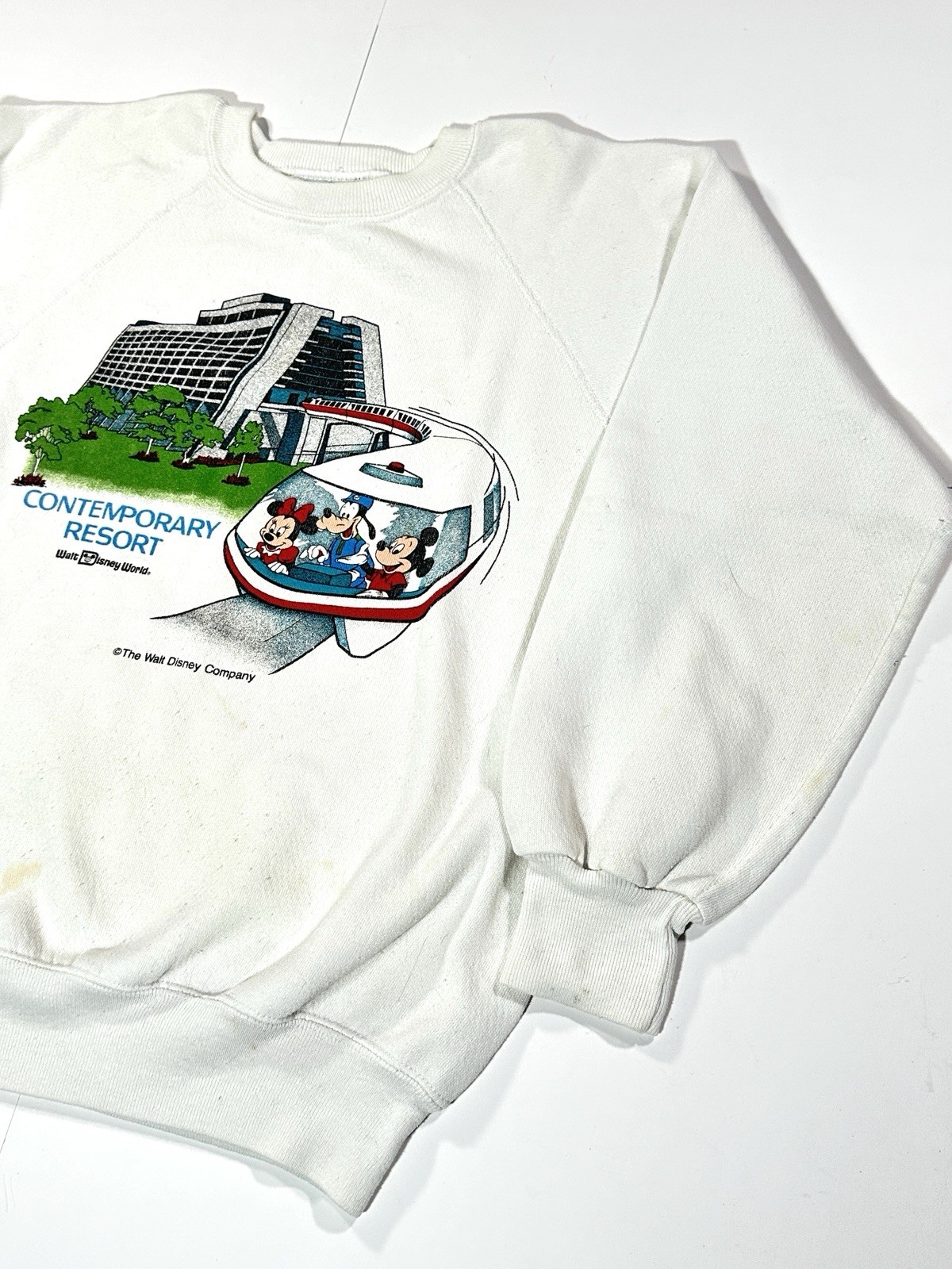 80s Vintage Original Walt Disney World Contemporary Resort Mickey Mouse Sweatshirt Medium Very decent condition overall - for - vintage 80s crewneck - see ALL photos very closely See photos for measurements - size medium however vintage shrunk fits smaller Crewneck has mild - moderate wear/tear overall throughout - mild - moderate age discoloration/fade both sides - has few little small stains / marks - spots towards bottom front side - mild stress overall throughout crewneck - etc - see ALL photos very closely for condition of the sweatshirt Will ship with care