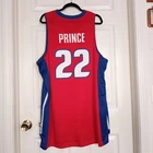 The product is a vintage Detroit Pistons Tayshaun Prince Reebok NBA jersey in men's size XL. This officially licensed jersey is in red color and features the Reebok branding. It is designed for fans of the Detroit Pistons and followers of the National Basketball Association (NBA) who appreciate the style of the former player Tayshaun Prince.