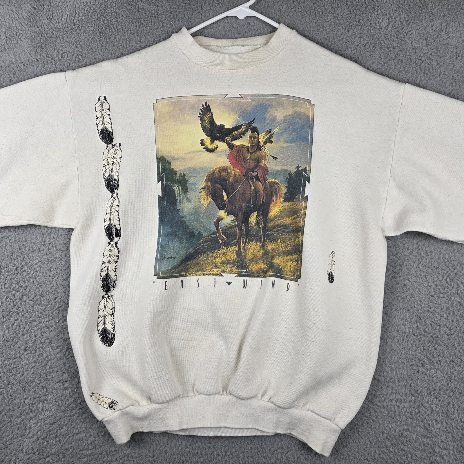 This vintage East Wind sweatshirt features a striking Western-style graphic of a Native American rider on horseback with an eagle in flight. The artwork is vivid and detailed, complemented by feather graphics running down the sleeve. A classic 1990s fit and soft fleece interior make this a standout collectible for Western and wildlife art enthusiasts. Condition • Pre-owned vintage wear • Light staining on front and sleeve shown in photos • General wear consistent with age • No holes or major structural damage Features • Large multicolor East Wind graphic • Feather sleeve print detail • Crewneck pullover style • Soft fleece interior • 90s oversized vintage fit • Off-white / cream color Measurements • Chest (pit to pit): 22" • Length (shoulder to hem): 26" Item Specifics • Brand: East Wind • Type: Sweatshirt • Era: 1990s • Material: Cotton/Poly blend (typical for era) • Color: Off-white • Graphic: Western / Native American / Horse / Eagle • Fit: Regular / Vintage Oversize