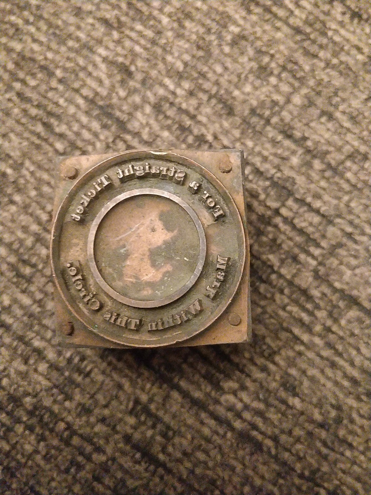 Vintage Metal Newspaper Printing Press Block Stamp Ink Plate. Church in Livonia, NY and Stewart National Bank, Mark within circle block