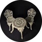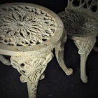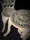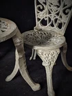 Vintage Victorian style cast-iron garden furniture set for dolls This lovely, early, very well-made, cast iron doll table and two chairs have matching detailed legs with lovely cut-out detail on the chairs. The table stands 16cm high, with a top diameter of 16cm (24cm with feet, at its widest), the chairs stand 23cm high, with a seat diameter of 10,5cm (17,5cm with feet, at its widest), and together weigh a 3,150kg.