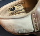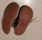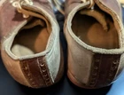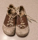 These vintage lace-up toddler saddle shoes would be a charming addition to your collection. The brown and white color scheme, combined with the saddle shoe look, gives them a classic, timeless appeal. The shoes are from the 1940s and are original, making them a nice find for collectors. The shoes are well worn, so please examine pictures to see condition. No attempt has been made to clean or restore them. They have been stored in a cedar chest for approximately 70 years
