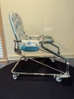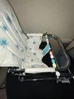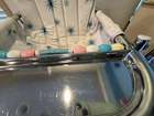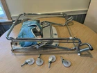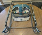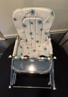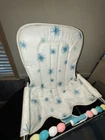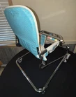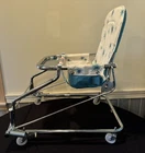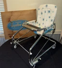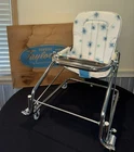 VINTAGE TAYLOR TOT BABY BOUNCER SEAT MADE by FRANK F. TAYLOR CO. in FRANKFORT, KENTUCKY MODEL # 73825 ~ MODEL NAME is GREEN FANTASY ~ COMES WITH ORIGINAL BOX FEATURES: HEAVY DUTY CHROMED METAL FRAME RUBBER PADS ON THE BOTTOM FOR NO SLIDE/NO SCRATCH YOUR FLOORS REMOVABLE BAKELITE WHEELS IF YOU WANT TO USE AS A WALKER WHITE & TEAL VINYL SEAT WITH STARBURST PATTERN 8 COLORED BEADS SLIDE BACK & FORTH NEAR THE TRAY CHROME TRAY FOR SNACKS OR TOYS EASILY FOLDS DOWN FOR STORAGE (folds to 7" tall x 21" wide x 25.5" long MEASURMENTS: 26" TALL (with wheels) ~ 23" TALL (without wheels) 20.5" WIDE IN THE FRONT, TAPERING TO 17" WIDE IN THE BACK 22.5" FRONT to BACK WEIGHT IS 11 LBS WITHOUT BOX SHIPPING INFO: 14 LBS ~ 22x26x10 BOX CONDITION: THIS ITEM SHOWS VERY LITTLE WEAR. THE CHROME IS BEATUIFUL THROUGHOUT. THERE ARE 2 VERY SMALL RUST SPOTS ON THE CHROME TRAY (in the crease area, see pic) THE VINYL SEAT IS VERY NICE, NO CUTS, HOLES, STAINS OR DAMAGE. SOME THREADS ARE SLIGHTLY DISCOLORED, BUT NOT VERY NOTICABLE. IT FUNCTIONS PROPERLY BAKELITE WHEELS ARE SUPER NICE, SHOWS BARELY ANY WEAR ITEM IS SUPER CLEAN & READY TO USE ~~~~~~~~~~~~~~~~~~~~~~~~~~~~~~~~~~~~~~~~~~~~~~~ This vintage baby bouncer chair is a must-have for collectors and baby enthusiasts alike. The TAYLOR TOT brand is known for its quality and durability, and this chair is no exception. Made with chrome and metal materials, it provides a sturdy seat for your little one. The teal and white color combination with the chrome frame adds a touch of charm to any room. This bouncer chair is perfect for babies and toddlers who need a place to sit and play. Its unique design and features make it a great addition to any baby carriage collection. Don't miss out on the opportunity to own this rare piece of history. I do combine shipping. If buying more than 1 item, please click "Add to Cart" instead of "Buy it Now". When you have completed your purchases, please click request invoice for your reduced shipping rate. Check out my other auction items! SHIPPING RATES CAN BE EXPENSIVE, ESPECIALLY ON HEAVIER ITEMS. I ENTER THE ESTIMATED PACKAGE WEIGHT AND DIMENSIONS ON THE LISTING, FROM THERE THE EBAY SHIPPING CALCULATOR CALCULATES THE ACTUAL SHIPPING CHARGES BASED ON YOUR LOCATION/ZIP CODE. I DO NOT MAKE A PROFIT ON SHIPPING CHARGES. I CHARGE A $1.00 HANDLING FEE PER PACKAGE TO COVER PACKAGING SUPPLIES (bubble wrap, peanuts, tape, boxes) AS THESE ITEMS GET VERY COSTLY OVER TIME. I TRY TO RECYCLE THESE TYPES OF ITEMS WHENEVER POSSIBLE. I PACKAGE YOUR ITEM VERY CAREFULLY TO ASSURE A SAFE DELIVERY. CHECK THE SHIPPING CALCULATOR BELOW FOR RATES BY ENTERING YOUR ZIP CODE. THANK YOU VERY MUCH FOR LOOKING!