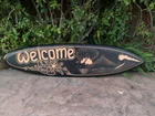 This beautiful hand crafted "Welcome" sign surfboard wall plaque has it all! A surfer catching a wave with swimming dolphins off of a tropical island! Welcome friends into your home, surf shack, or Tiki Bar with the coolest welcome sign around. It would make a great addition to your home, patio, or tiki bar. It is hand carved with intricate detail from top-of-the-line mango wood. It is flat back to hang on the wall. This surfboard would make an awesome gift! 39x 10 inches.