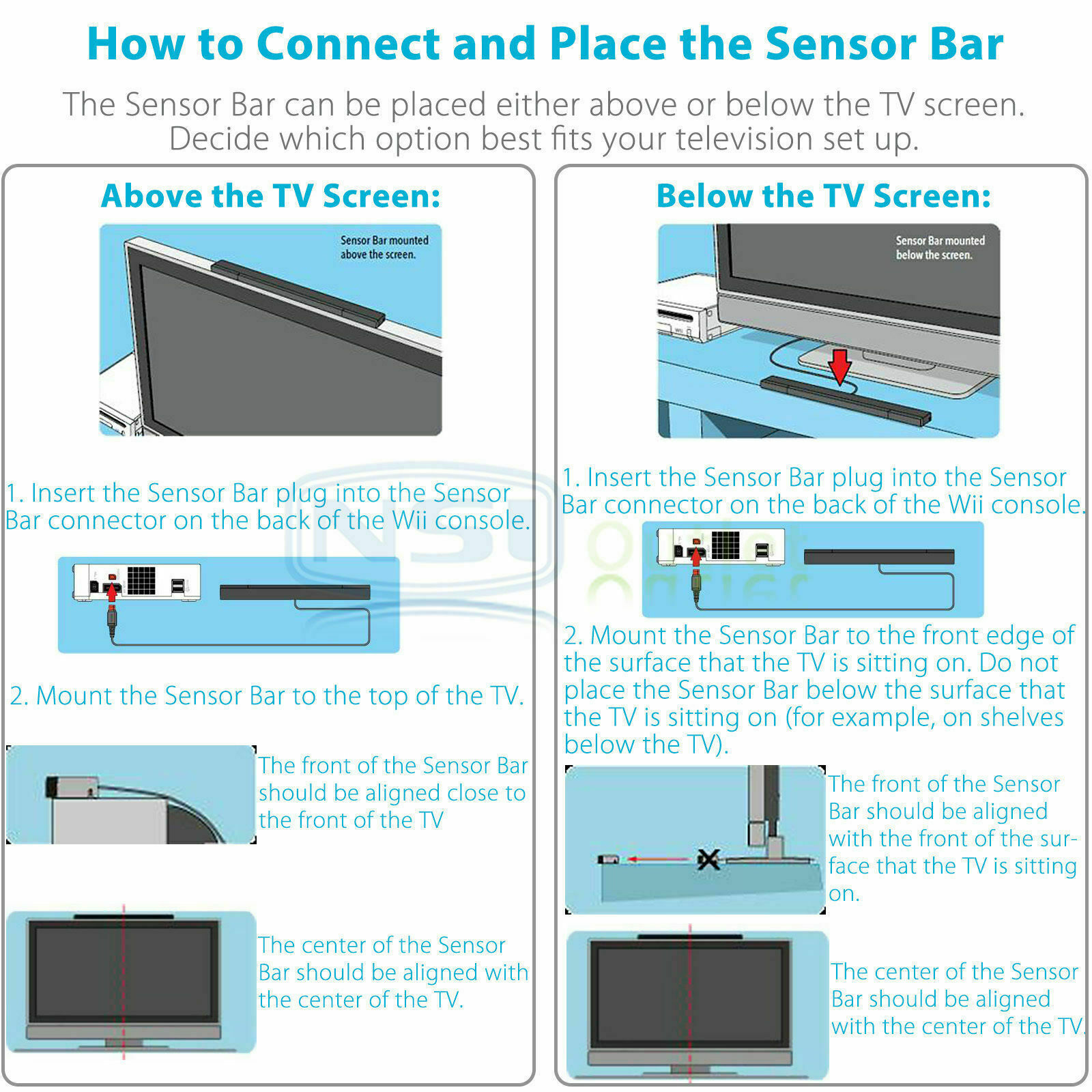 Brand New FAST SAME DAY SHIPPING Product Description The sensor bar is able to receive infrared signal from the Nintendo Wii & Nintendo Wii U Console and is the perfect replacement for a faulty or broken receiver. Works in conjunction with the Nintendo Wii Remote. Easy to use, only need connect the inductor's plug to the Wii console. More than 7ft cable ensures convenient placement of sensor bar. Product Features 100% brand new and high quality guaranteed. Wired Infrared IR Ray Motion Sensor Bar with Stand for Nintendo Wii & Wii U Console. The sensor bar can be placed either above or below the TV screen(Wii System Is Not Included). Easily play your emulators using the USB plug & play sensor bar. Connects to the sensor bar port on the pack of the Wii console. Great replacement for your lost or broken Nintendo Wii / Wii U sensor bar. Easy plug and play, all you have to do is adjust the calibration of the sensor. Long cable allows you to mount the sensor above your TV or on the wall without worrying about stretching the cable. Includes stand with adhesive for easy attachment to tv, monitor or any smooth surface. Wired Sensor Bar Only, Wii System Is Not Included. How to Use The Sensor Bar can be placed either above or below the TV screen. Decide which option best fits your television set up. Above the TV Screen: 1. Insert the Sensor Bar plug into the Sensor Bar connector on the back of the Wii console. 2. Mount the Sensor Bar to the top of the TV. 3. The front of the Sensor Bar should be aligned close to the front of the TV and the center of the Sensor Bar should be aligned with the center of the TV. 4. If you have not already done so, be sure to set the Sensor Bar option in the Wii console's System Setting to "Above TV." This will help ensure an optimal experience. 5. Reception may be improved by mounting the Sensor Bar to the top of the TV with the Sensor Bar Stand. Below the TV Screen: 1. Insert the Sensor Bar plug into the Sensor Bar connector on the back of the Wii console. 2. Mount the Sensor Bar to the front edge of the surface that the TV is sitting on. Do not place the Sensor Bar below the surface that the TV is sitting on (for example, on shelves below the TV). 3. The front of the Sensor Bar should be aligned with the front of the surface that the TV is sitting on. The center of the Sensor Bar should be aligned with the center of the TV. 4. If you have not already done so, be sure to set the Sensor Bar option in the Wii console's System Setting to "Below TV." This will help ensure an optimal experience. Package Includes: 1x Wii / Wii U Sensor Bar with Holder Shipping Details: Providing FREE SHIPPING Same Day within U.S.A All orders before 5PM Eastern Standard Time will be shipped out same day -- Monday through Friday. If we are provided with an incorrect shipping address we reserve the right to charge for any fees associated with any consumer related errors. Tracking is available upon purchase of "USPS First Class Package." Please be aware that we provide tracking for orders over 11.00 - if you do purchase tracking for orders over 11.00 unfortunately we won't be able to refund you the fee. Refund & Return Details: 30 Day Returns on all items purchased directly from us Return policy starts from day of purchase. Do not ship any items without prior contact. Return shipping is the responsibility of the buyer.