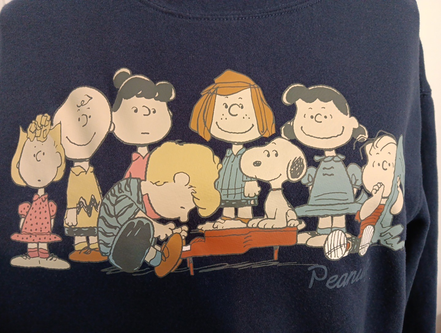 Very cute, gently pre-owned sweatshirt featuring the Peanuts gang, including Snoopy in size small. The color is navy blue. The interior is very soft. Please message me for additional photos, measurements, or information.