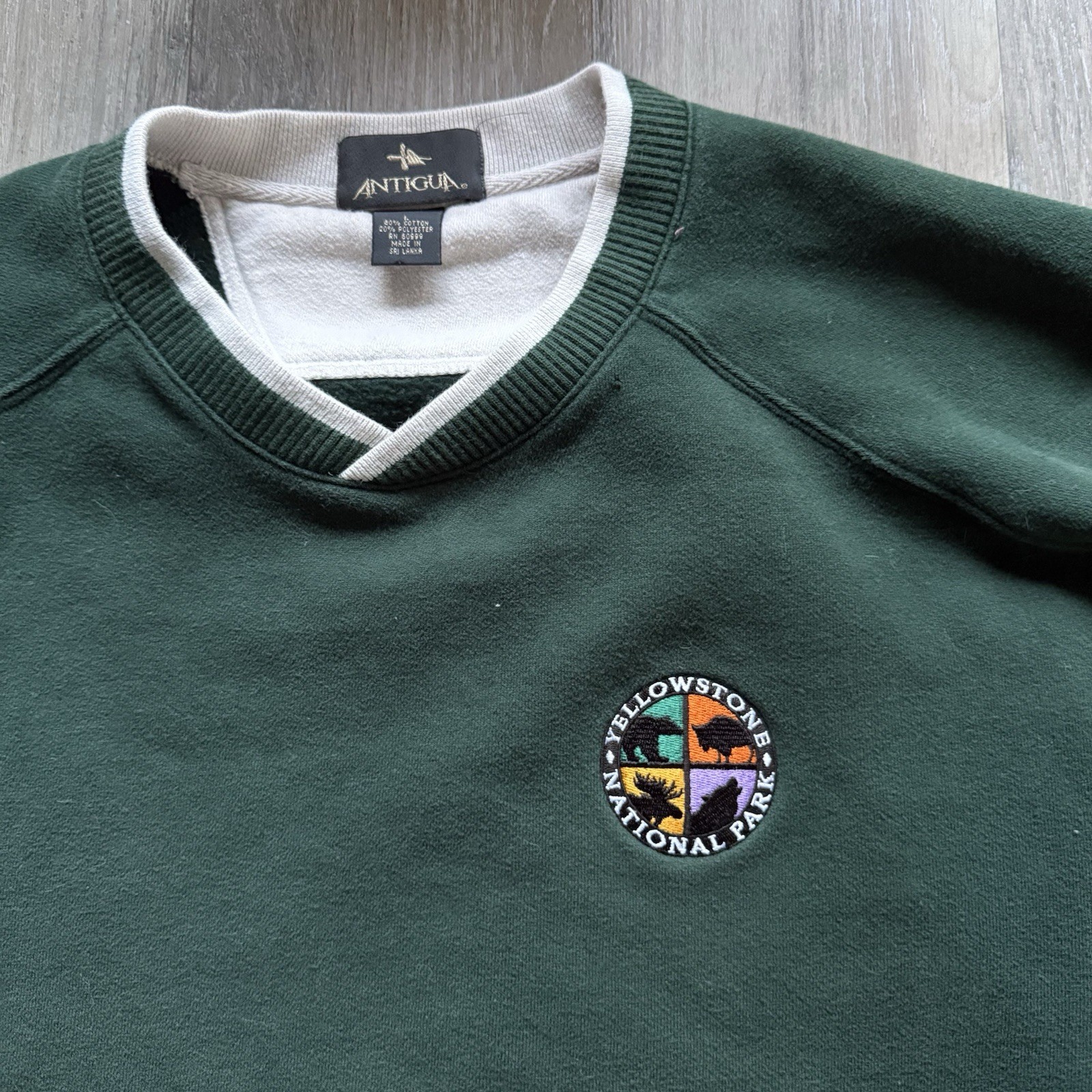 This Yellowstone National Park Forest Green Sweater Men's Large Crewneck Sweatshirt is a stylish and comfortable pullover sweatshirt made of soft cotton fleece material. The solid green color, crew neck, and long sleeves make it perfect for the winter, fall, and spring seasons. With the Antigua brand and Gildan Heavy Blend product line, you can trust that this sweatshirt is machine washable for easy care. Ideal for casual wear, this sweatshirt is a great addition to any man's wardrobe.