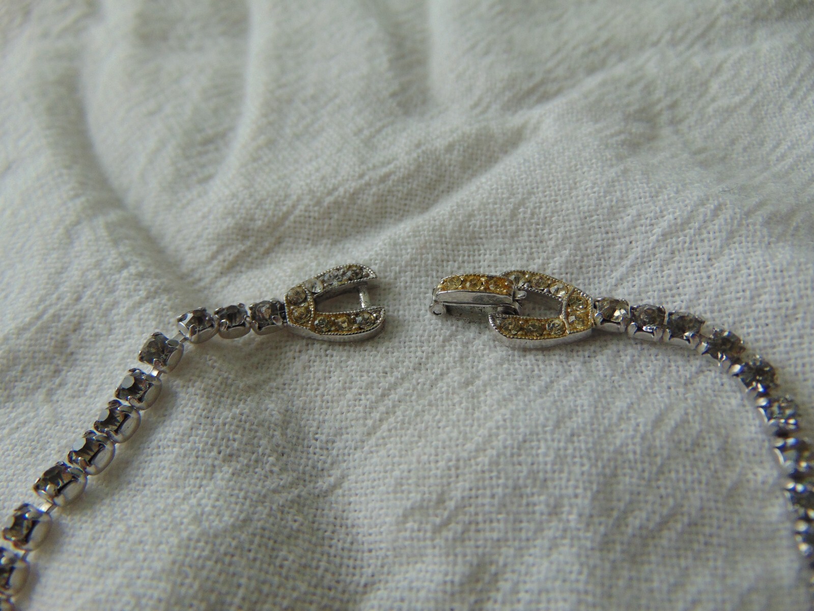 16 inches long, signed Kramer of New York on back of clasp. has several discolored rhinestones but still sparkling. jewelled clasp.